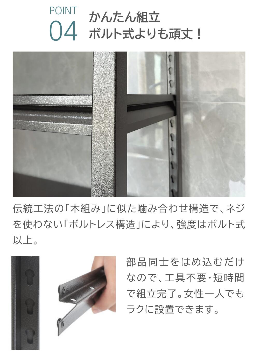 ※ 面倒なネジ・ボルト作業は一切不要!市販のラックによくある複雑な組立とは違い、本製品は工具いらずのはめ込み式(ボルトレス式)。縦フレームを立てて、横フレームをカチッとはめ込むだけ。あとはゴムハンマーで軽く叩くだけで組立完了!女性一人でもラクラク。組立のストレスを最小限に抑えました。