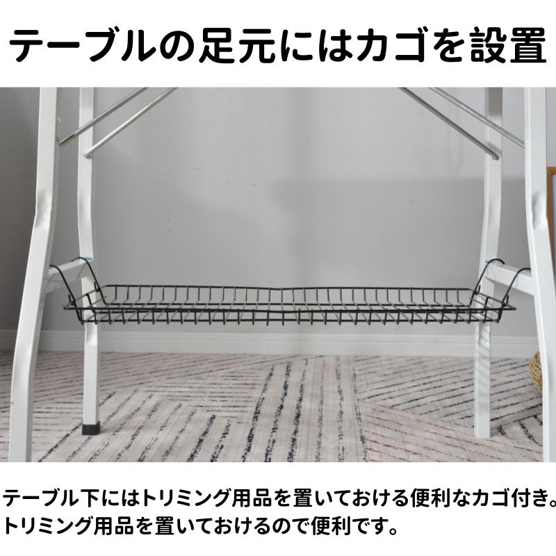テーブル下にはトリミング用品を置いておける便利なカゴ付き。トリミング用品を置いておけるので便利です。