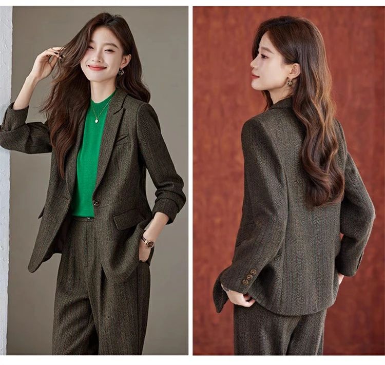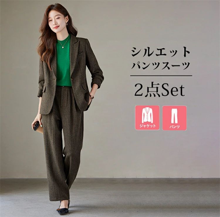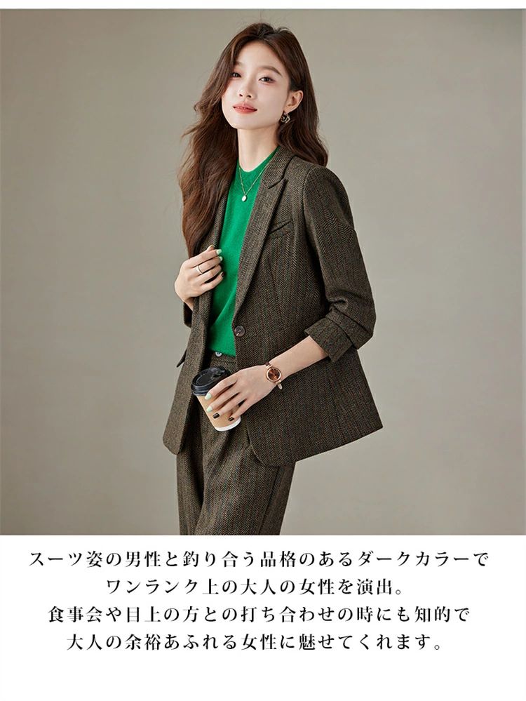 洗練されたヘリンボーン柄が、クラシックでありながらモダンな印象を与え、どんなトップスとも相性が良いです。このスーツ一つで、多様なスタイリングが楽しめるため、毎日のコーディネートがさらに楽しくなること間違いなしです。