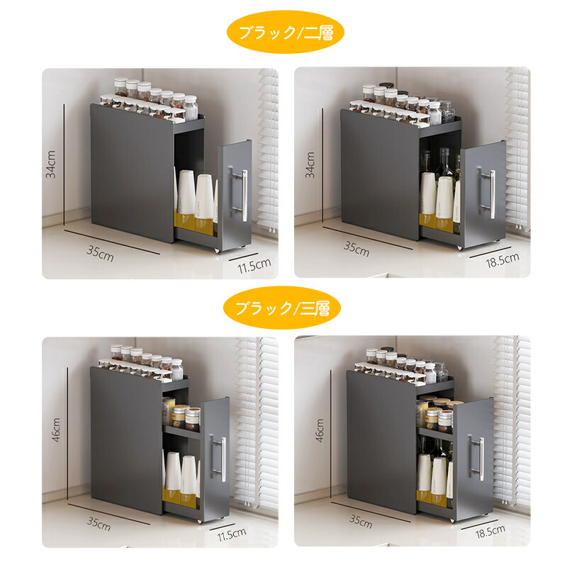 幅は11.5cmと18.5cmの2タイプから選択可能で、コンロ脇の隙間や冷蔵庫横、キッチン扉の裏面など、これまで活用が困難であったデッドスペースにも適切に設置できます。また、2段または3段の可動式棚を備えており、調味料瓶の高さに応じて自由に位置調整が可能であり、大型のオイルボトルから小型のスパイス缶まで、さまざまなサイズの調味料を効率的に整理整頓できます。