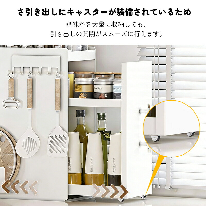 付属の引き出しは計量スプーンや個包装のスパイス、キッチンクリップなどの小物を収納でき、カウンター上の視覚的 clutter を軽減し、清潔で整然としたキッチン環境を実現します。さらに、引き出しにキャスターが装備されているため、調味料を大量に収納しても、引き出しの開閉がスムーズに行えます。
