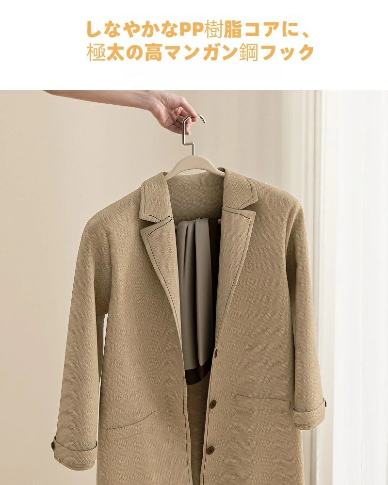 丈夫な樹脂素材を採用し、最大5kgまで耐えられる強度(一般的なハンガーの2~3倍の負荷に耐える)で、厚手のコートやダウンジャケットもしっかり支えます。さらに表面は「マット加工」で処理――光沢がなく、衣類との摩擦を最小限に抑え、絹・ウール・カシミヤなどのデリケート素材も引っかき傷や毛玉を防ぎます。