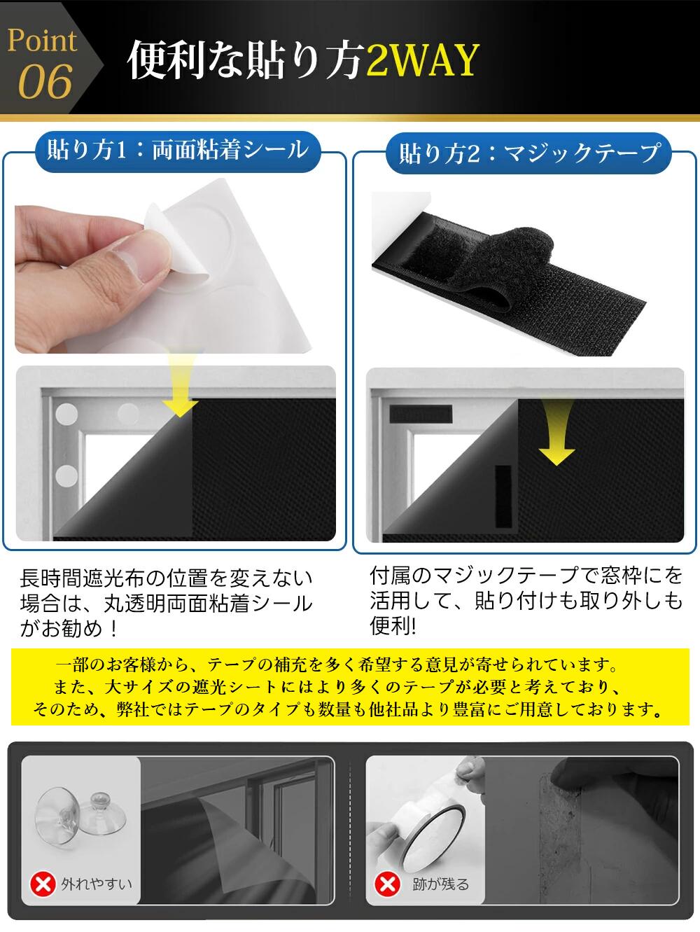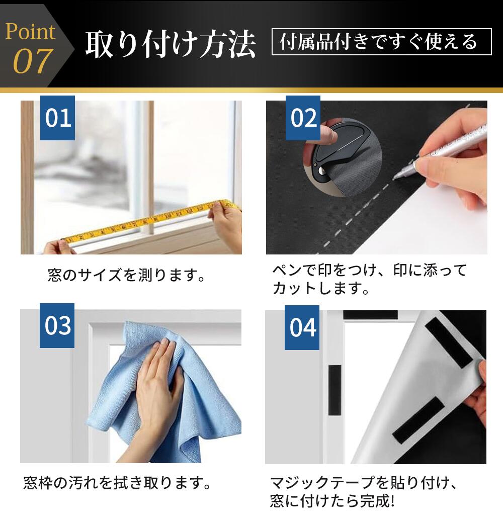 ※窓の形状にもよりますが、遮光効果を高めるために、捲れやすい角はL字型に面ファスナーを貼るのがおすすめです。 また、貼った後に光漏れが気になる箇所があれば付属の丸型の面ファスナーで固定箇所を増やしてください。