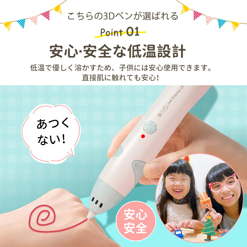 危険がない安心・安全なキッズ向けシリーズ!低温溶け特性のPCL材料を使用、優しく低温で溶かしながら子供にも安心して使用できます。ノズルから出たフィラメントは指で修正を加えることもできます。