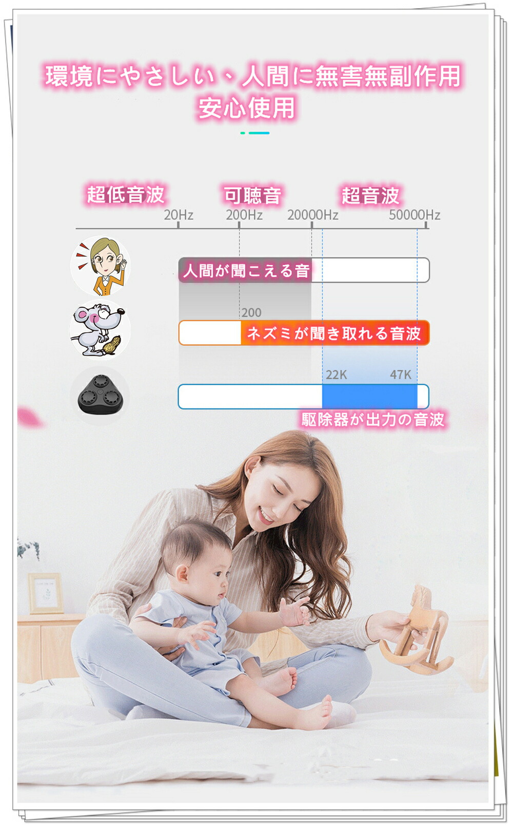 ネズミ撃退器は発信される超音波、電磁波は妊婦や子供やベットや室内の電気製品などに全く影響を与えてません。音波が人の耳と聴覚の範囲を下回っており、たったネズミなどの害獣または害虫の神経のみ影響を与えております。妊婦や子供がいる家庭でも安心してご使用いただけます。ネズミなどを追い払う効果は2~3週間連続して使用した後に表れます。