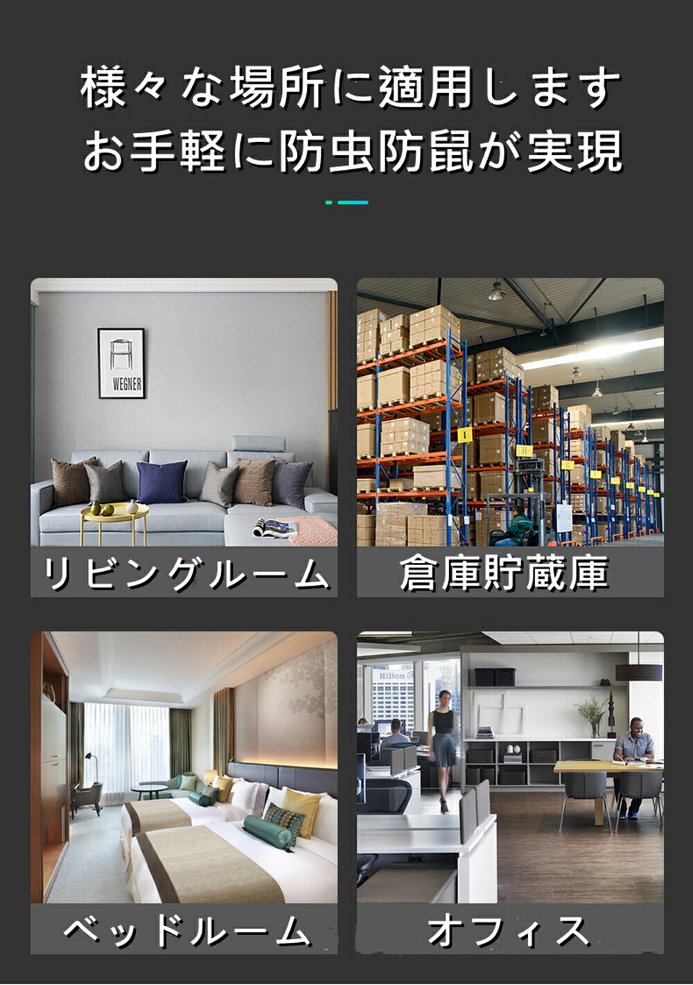 製品は50mA-80mA/8-10Wの入力超音波の周波数22~85khzで球型範囲で約200平方メートルがカバーできます。全方位に音波を発射することができ、360度の音波が立体的にサラウンドして、音波透過性が優れ、家庭、倉庫、ホテル、レストラン、事務室などに適しています。