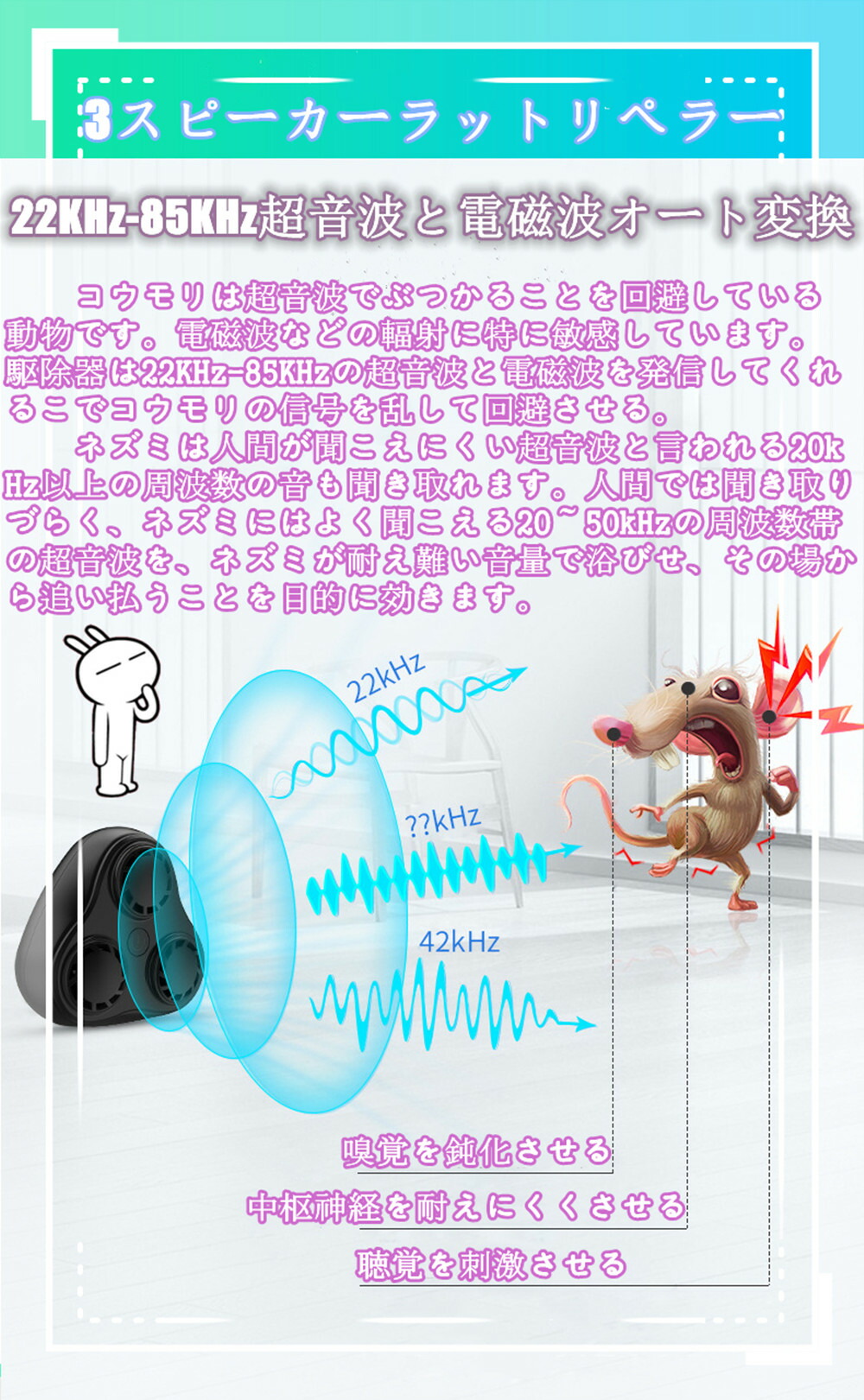 ネズミ駆除器はスピーカー3個で強化されてネズミに聞こえて人に聞こえない超音波を発生させてネズミを追い払っております。ネズミにだけ聞こえる音を出し続けることによって、ネズミにストレスを与えて巣から追い出したり、侵入しても巣を作らせない効果などが期待できます。