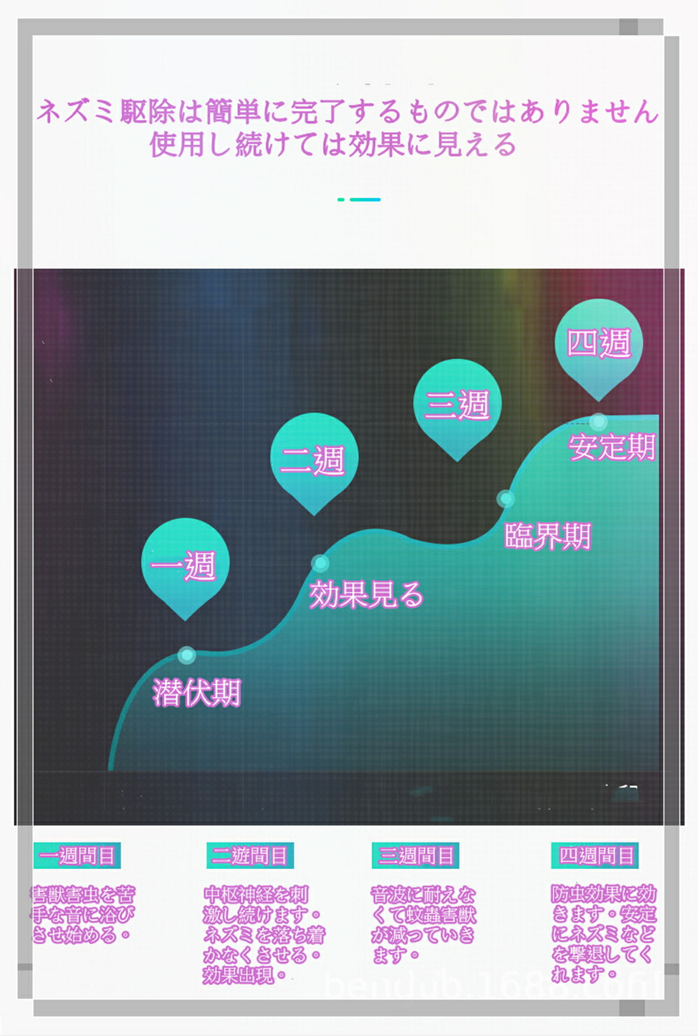 強化型の音が超音波と電磁波を切り替えられます。定期的に周波数をじ変更すれば、ネズミがしばらくすると音に慣れてしまったため、効果に薄くなってしまうことを防ぎます。違う音波が切り替えはコウモリが発する信号を混信して、部屋に遠ざかる忌避させます。長期的に害獣害虫に苦手な音を浴びさせて中枢神経へテンションを与えてやり。コウモリ、ネズミなどの害獣、害虫を寄せ付けないで忌避の機能を発揮し続けます。