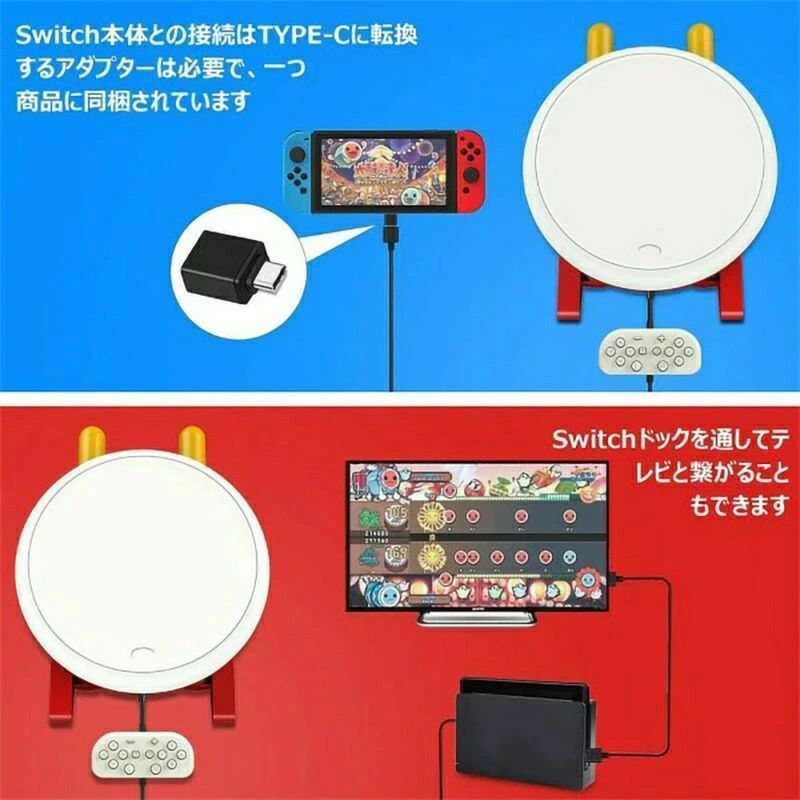 【接続方法】太鼓の達人にNintendo Switch本体やNintendo Switchドックを通してテレビと接続の2つの使い方があります。Switch太鼓本体と直に接続するため、Type-C転換アダプターは1つ同梱されます。