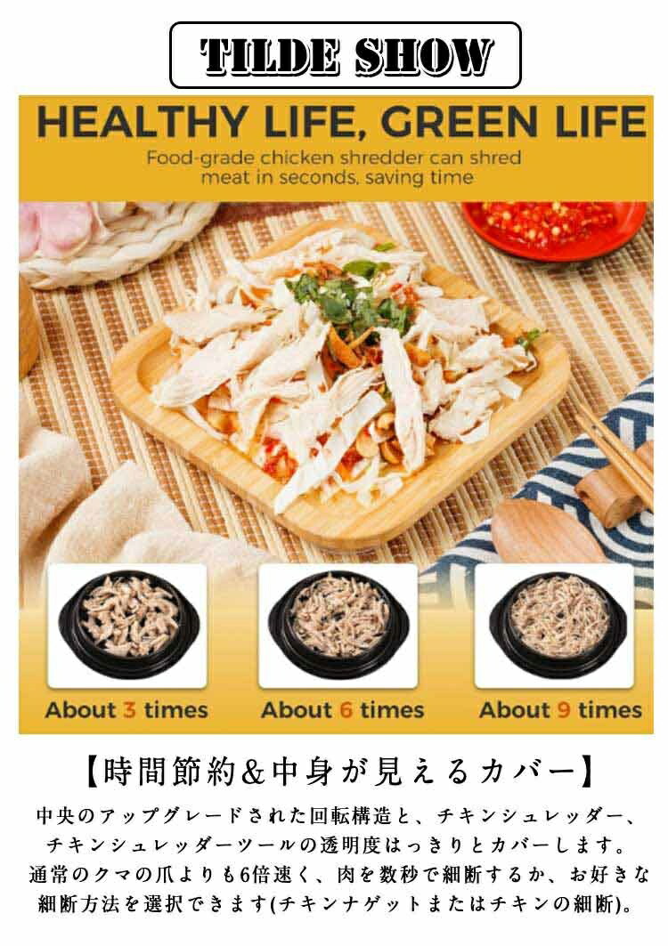 中央のアップグレードされた回転構造と、チキンシュレッダー、チキンシュレッダーツールの透明度はっきりとカバーします。通常のクマの爪よりも6倍速く、肉を数秒で細断するか、お好きな細断方法を選択できます(チキンナゲットまたはチキンの細断)。