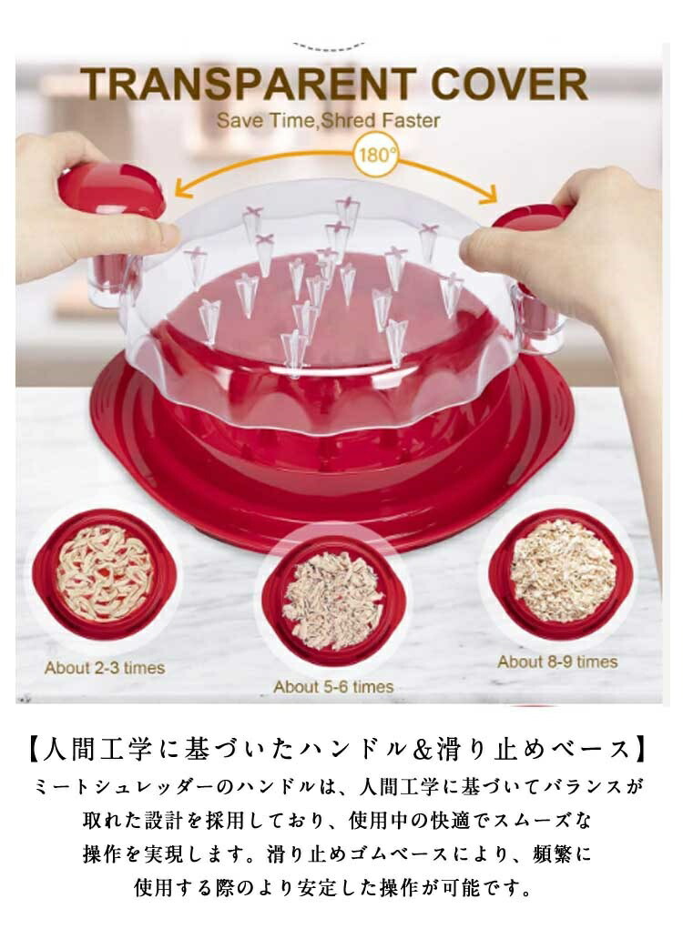チキンシュレッダー 鶏胸シュレッダー ツールツイスト クリアカバー付き ミートシュレッダー 滑り止め チキングラインダー 豚肉 牛肉 チキン 食洗機対応 人間工学ハンドル ねじれ 透明蓋 耐熱 ツール