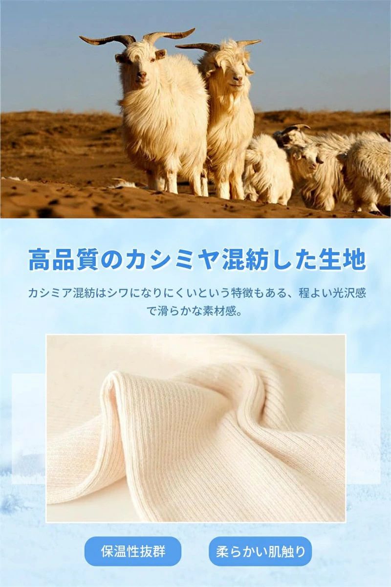 コットンに比べ、カシミヤ混紡した生地ならではのしなやかさがあります。肌に優しくて、首周りを包み込む軽い被り心地で、暖かくて気持ち良く着けます。高い保温性保湿性を持ちながら、チクチクしない着け心地が特徴です。