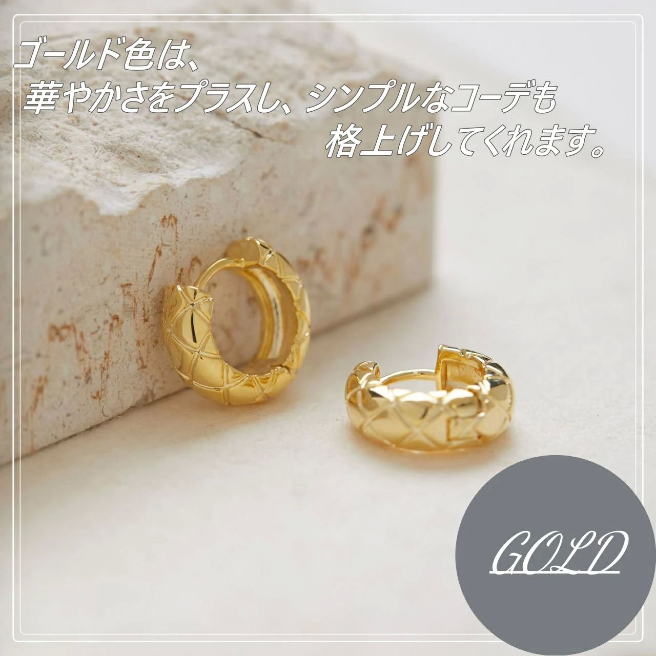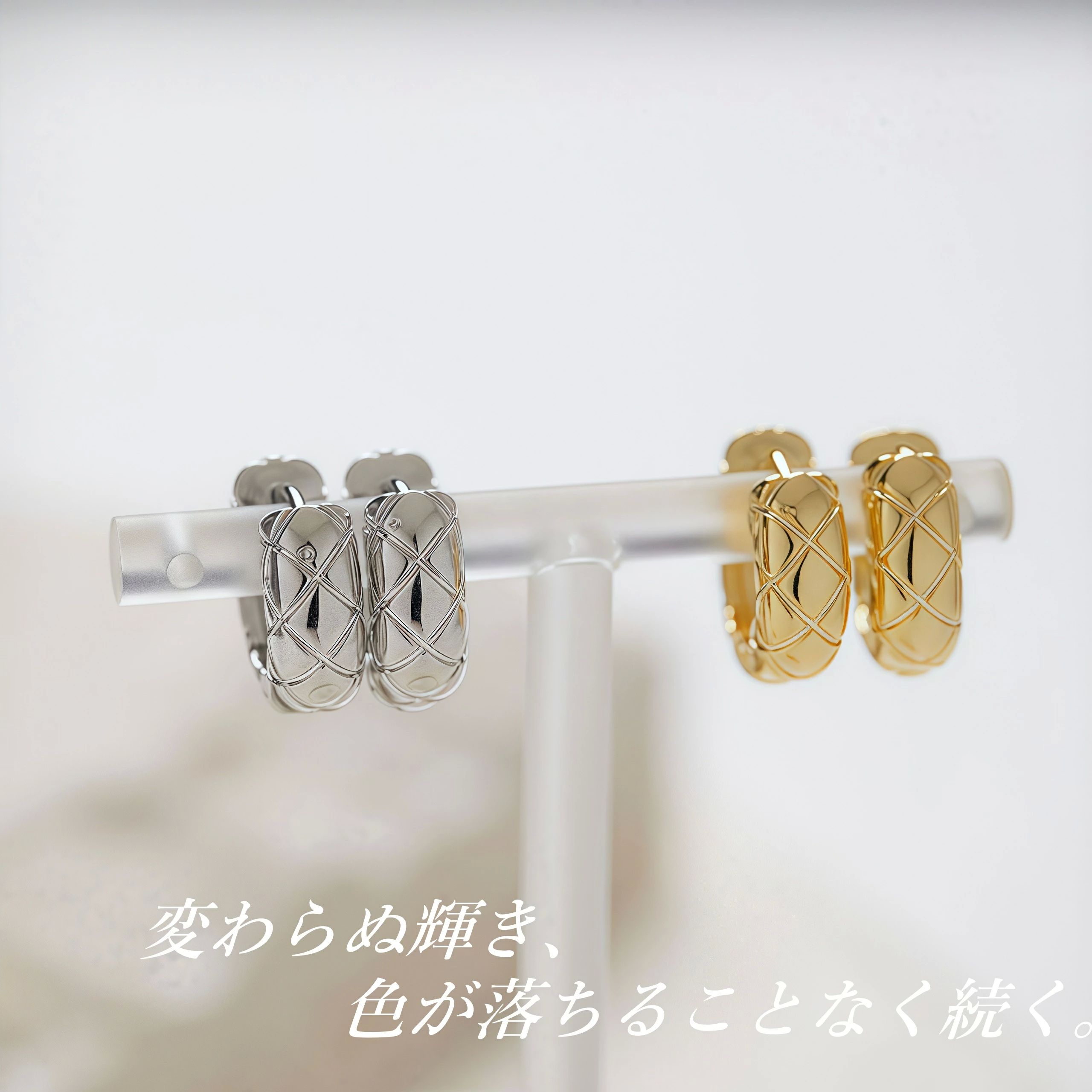 シンプルでありながら、洗練された輝きを放つこのイヤリングは、K18コーティングが施され、どんなシーンでも輝きを持続。自然の光を浴びることで、その上品な輝きがより一層引き立ち、耳元を華やかに演出します。