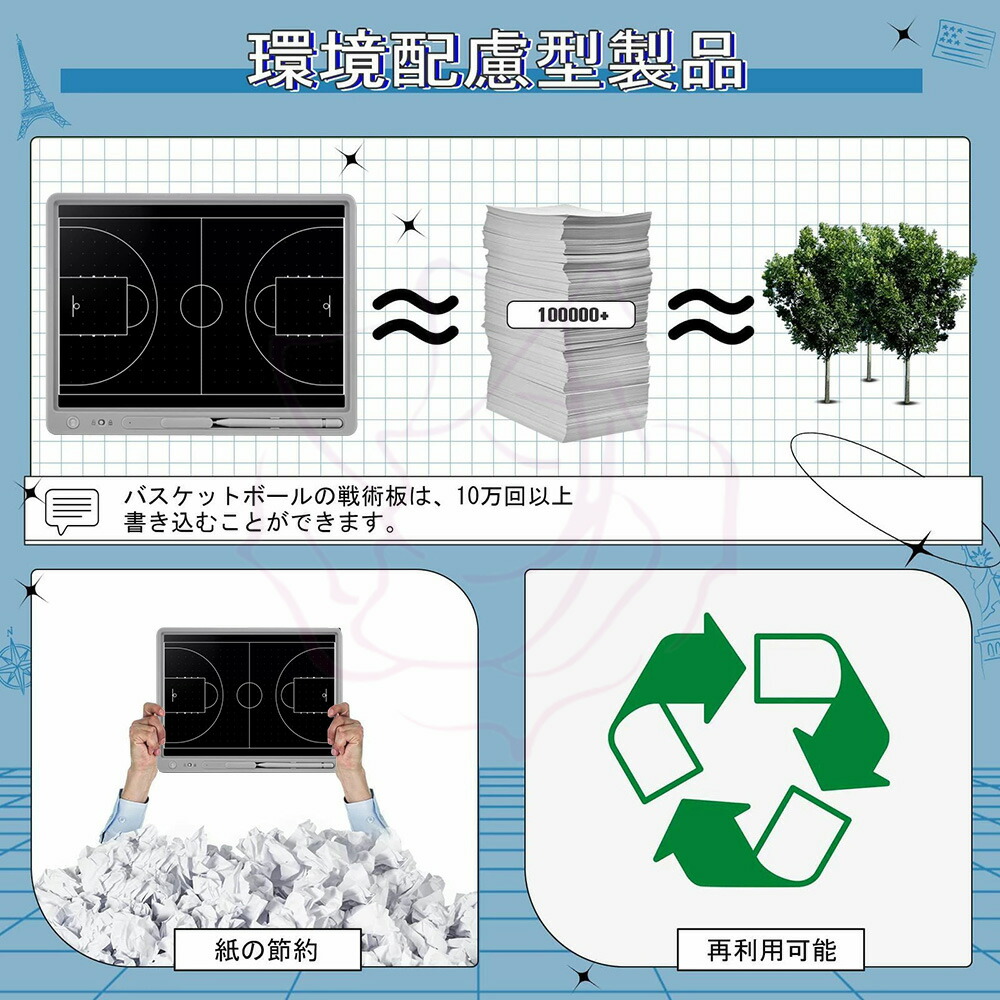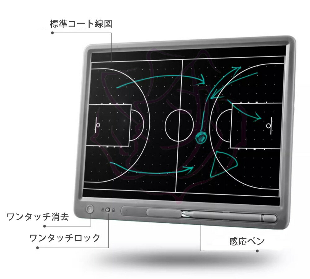 【15インチ 作戦ボード】 最新鋭のフレキシブル液晶画面と高感度感圧技術を採用し、滑らかなストロークと目を引くラインを実現した液晶バスケットボールコーチングボードです。 線の太さは筆圧によって変化します。無放射線、グレアフリー、100%アンチブルーライトで、目を刺激しません。 梱包内容 「バスケ 作戦ボード*1、タッチペン*1、マニュアル*1 」