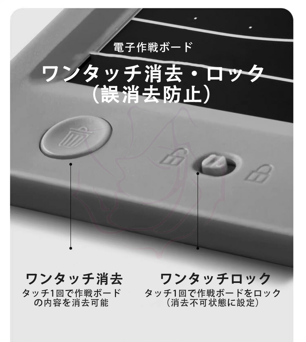 【ワンタッチクリアと画面ロック】ワンタッチで画面をクリアできる機能があります。 もうコンテンツを一つ一つクリアする必要はありません。ロックボタンをオンにしてクリアボタンをタップすれば、1秒で簡単にすべてのコンテンツをクリアでき、時間の節約と生活のしやすさを実現します。 また、コーチボードにはロックスクリーン機能があり、作成したエキサイティングな戦術をロックし、誤って削除してしまうことを防ぎます。 また、タッチペンの紛失を防ぐために、ペンスロットを装備しています。