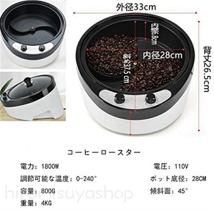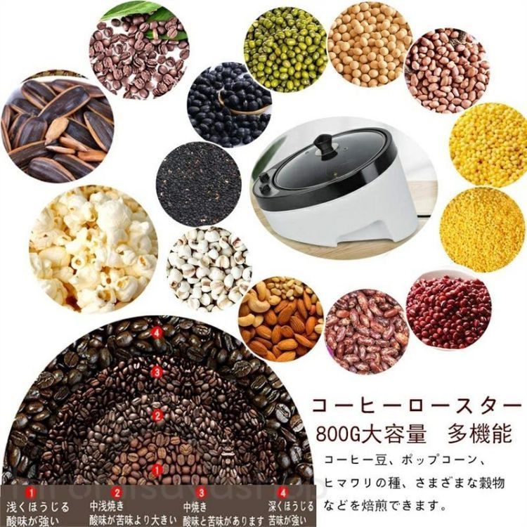 製品仕様 ・商品サイズ:奥行70cm×幅40cm×高多機能大容量コーヒーロースター: 大容量800G、ハイパワー1800W。高効率、高速加熱、 攪拌均一。それはコーヒー豆、ポップコーン 豆、ひまわりの種、穀物、ナッツ、ピーナッツなどを焼くことができます。 新しくアップグレードされた攪拌棒:攪拌棒が高まり、広がり、攪拌がより均一になります。取り外し可能な攪拌棒:お手入れが簡単。 傾斜45度デザイン:傾斜面のデザインが高くなっているため、コーヒー豆をより均一にローリングおよびローストできます。非粘着性コーヒー豆焙煎底 :テフロン底はより均一に加熱されています。 効率的な放熱と簡単な清掃。 調節可能な温度:加熱温度範囲:100°-240°あなたは手動であなたの必要性に従って温度を調節することができます。自動車の恒温は時間と人手を節約します。 透明ガラスカバー:焙煎したコーヒー豆を見やすくしわ防止ハンドル:ハンドルは厚くて耐熱性のある素材でできており、安全で安定していて丈夫です。さ60cm