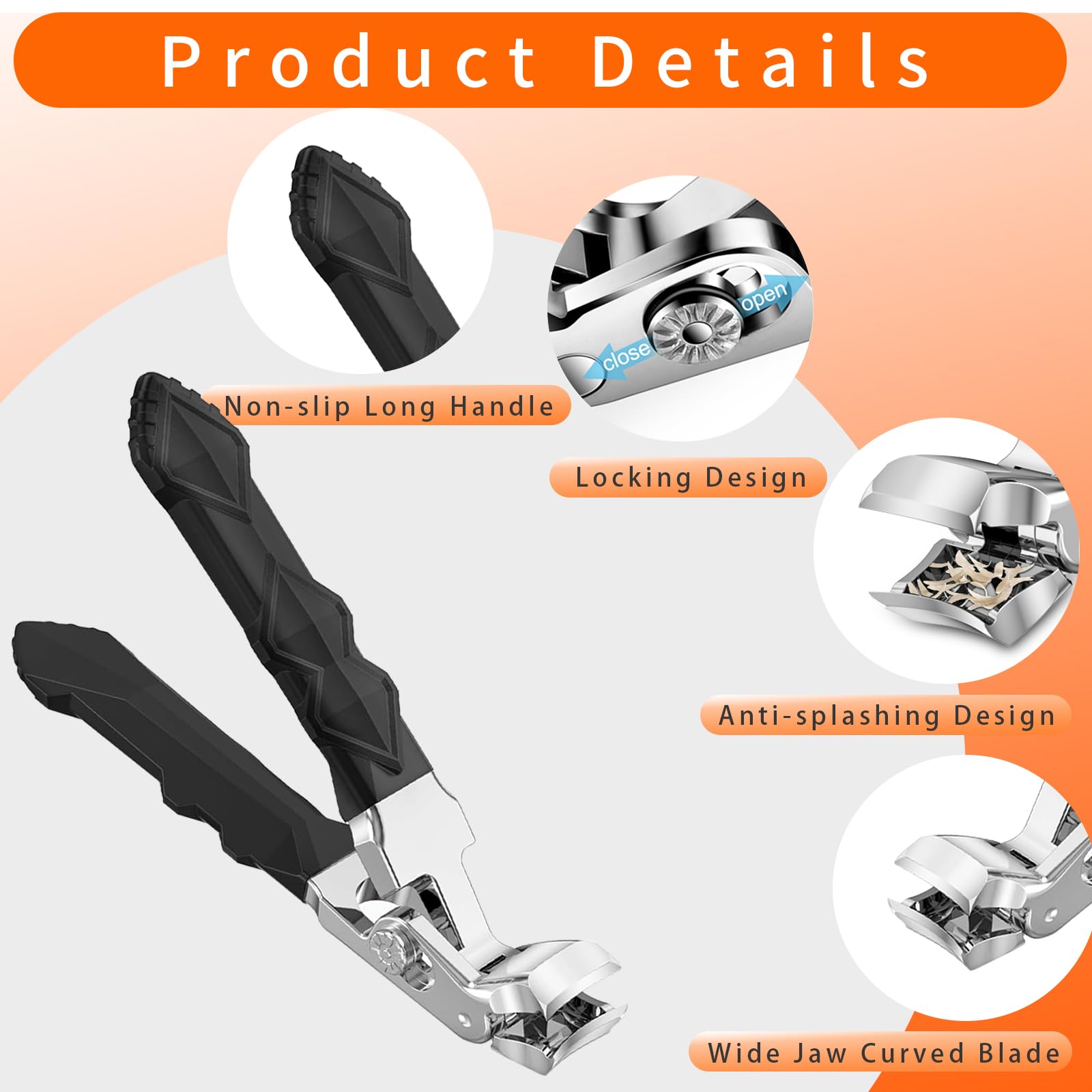【人間的な設計】当社の高齢者用爪切りハンドルには、快適で人間工学に基づいたグリップのための長いハンドルの滑り止めデザインが付属しています。 爪切りの安全ロック、先端のカーブ、アンチスプラッシュデザインは、高齢者にとってより安全で便利で、低頭で曲げる必要性を効果的に減らします。
