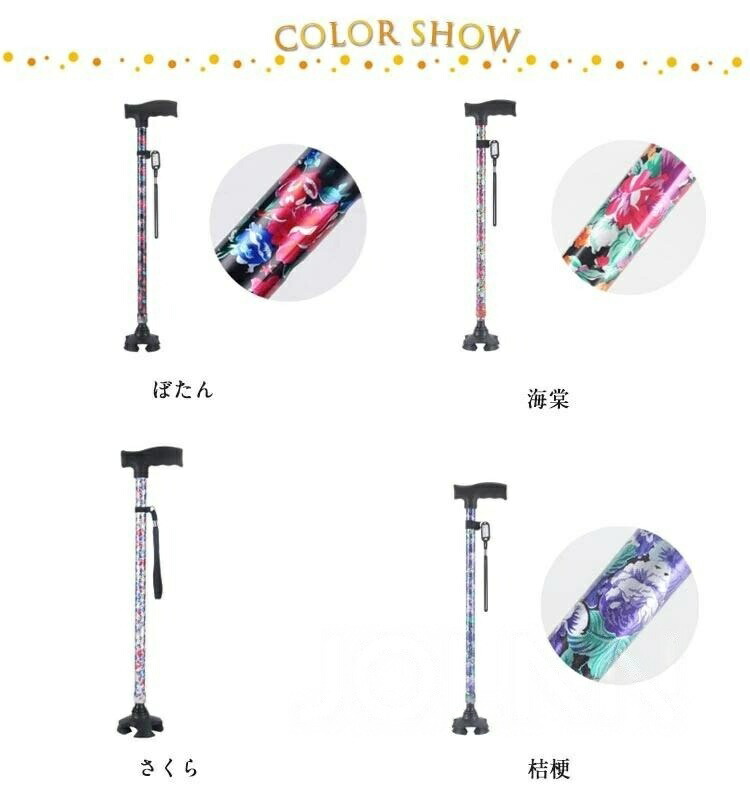 杖 自立式 四点杖 軽量 女性 介護 ぼたん 海棠 さくら 桔梗 パーブル花 フラワー 葉 青葉