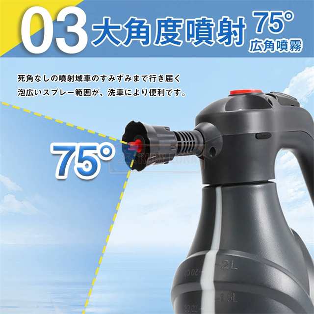 ◆扇形スプレーデザインで設計され、その70°の特大扇形スプレー範囲は車のボディ全体を均等にカバーし、汚れやグリースを効果的に洗浄する豊かで完全に乳化した泡を確保します。