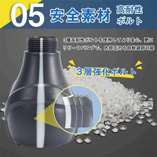 【細部にわたる設計の見直しと改善】◆本製品に搭載している予圧機能によって、一般的な多くのスプレーボトルでよく見られる、噴霧を開始するときの圧力不足の問題を解決しています。