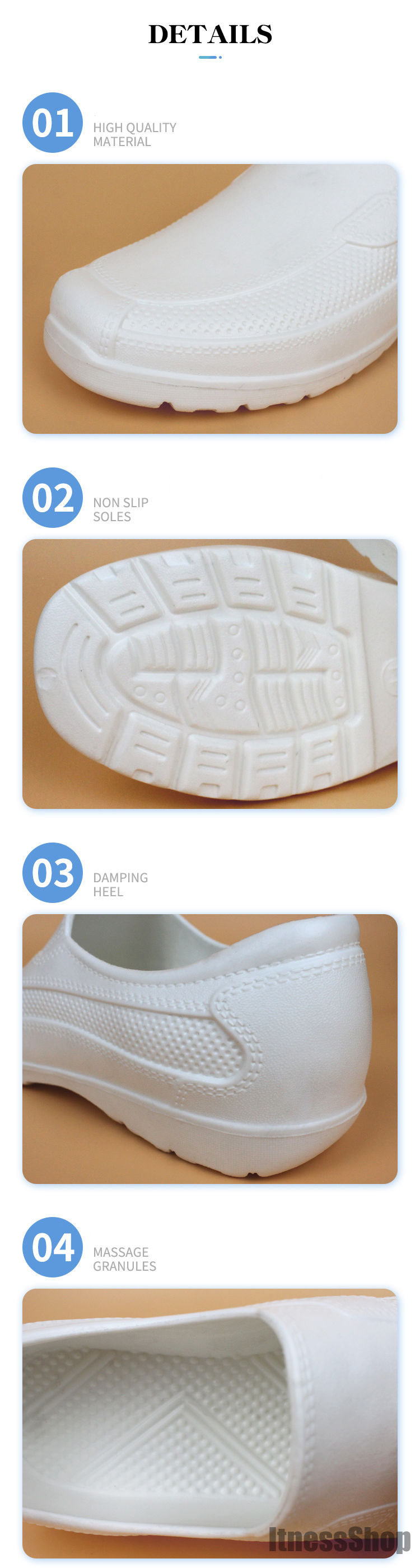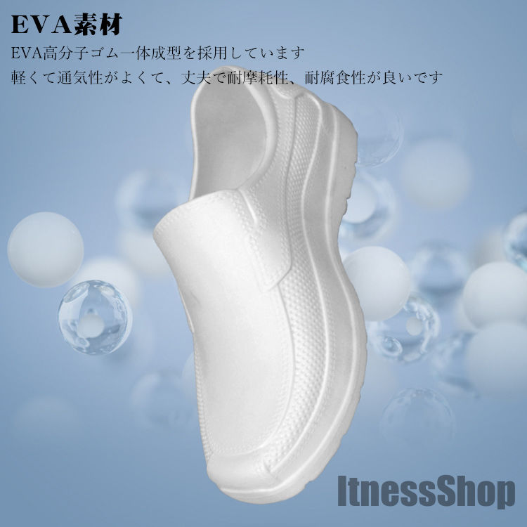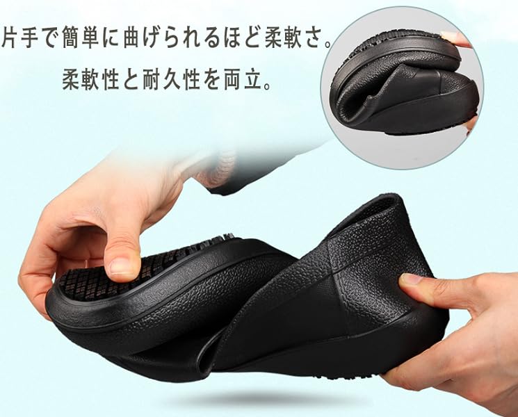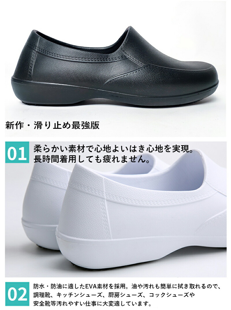 防水・防油に適したEVA素材を採用。油や汚れも簡単に拭き取れるので、調理靴、キッチンシューズ、厨房シューズ、コックシューズや安全靴等汚れやすい仕事に大変適しています。