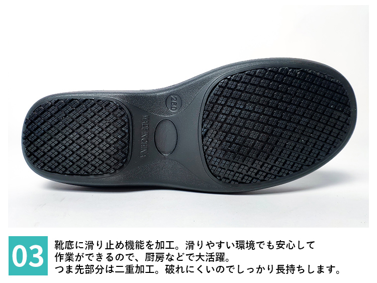 靴底に滑り止め機能を加工。滑りやすい環境でも安心して作業ができるので、厨房などで大活躍。