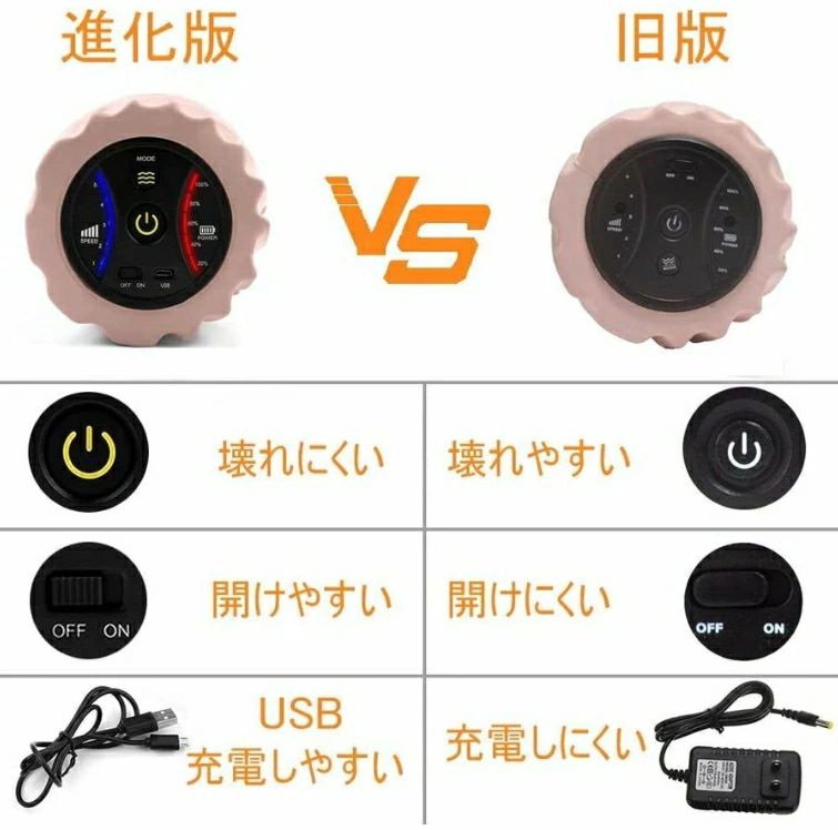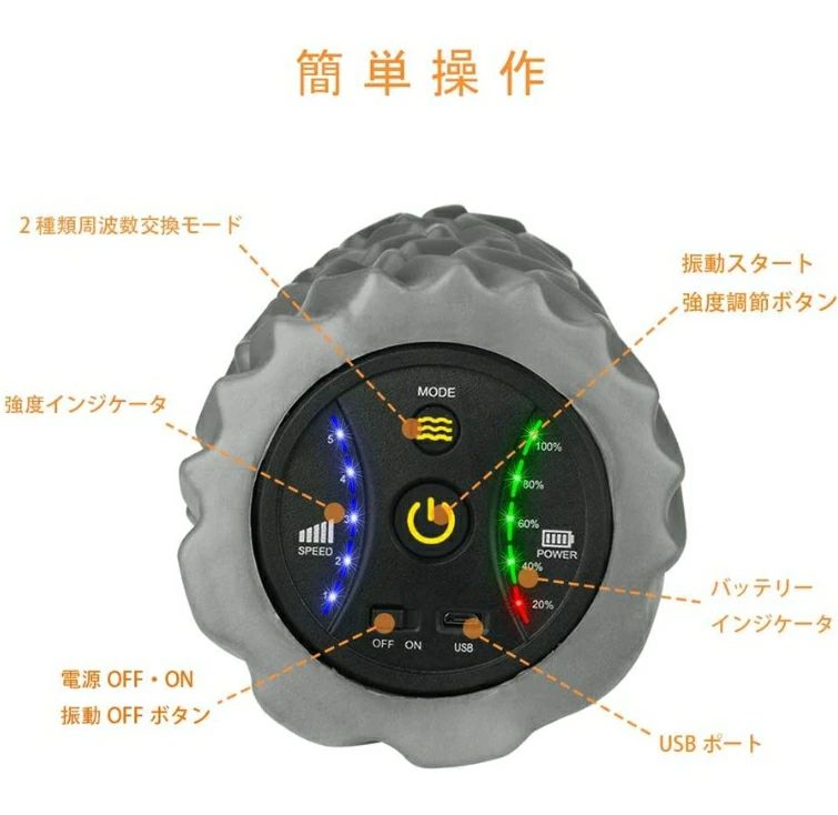 「USB充電式&操作便利」以前の充電方法より簡単で便利なUSB充電を採用して、簡単USB充電のため、車の充電設備やモバイルバッテリーやコンピューターなどのUSBインターフェイスを備えた電源装置と互換性があります。どこでも簡単に充電できます。電源ボタンは良い素材で作られて、壊れにくくなります。 最大振動強度で2時間持続する内蔵PSE充電式バッテリーも付属しています。このマッサージローラーの操作はとても便利で、ボタンを押すだけで、異なる振動レベルを自由に調節できます。