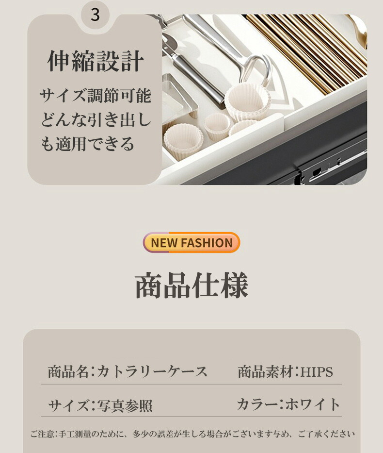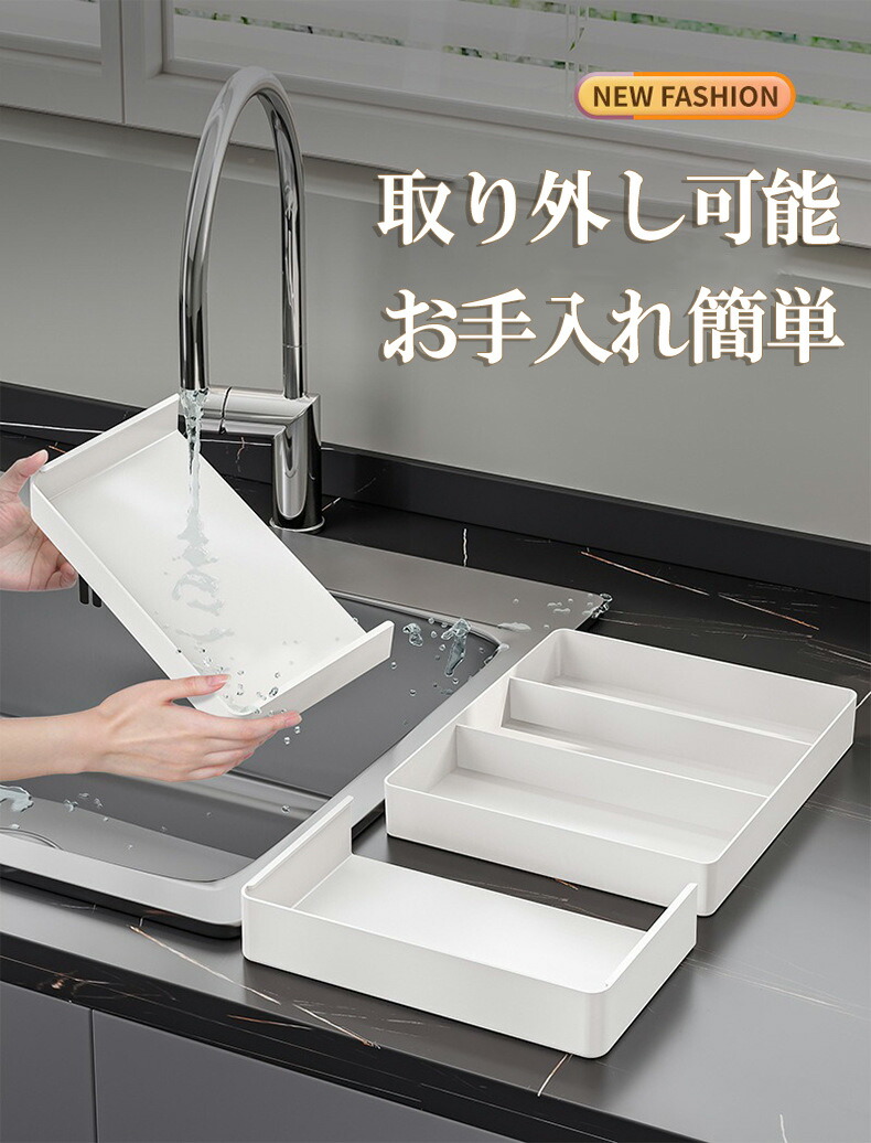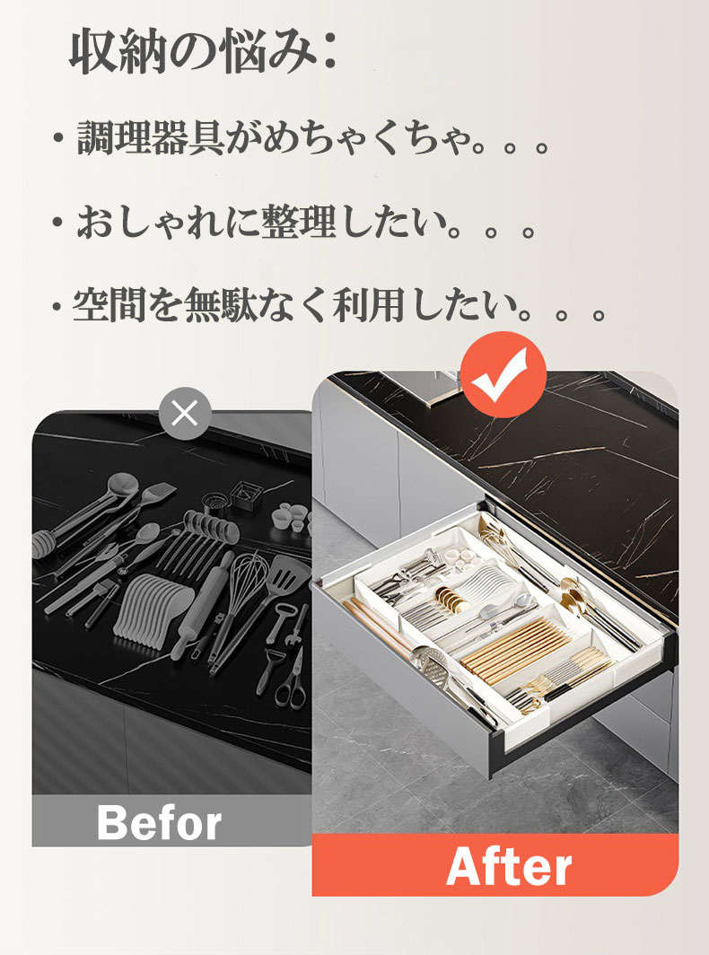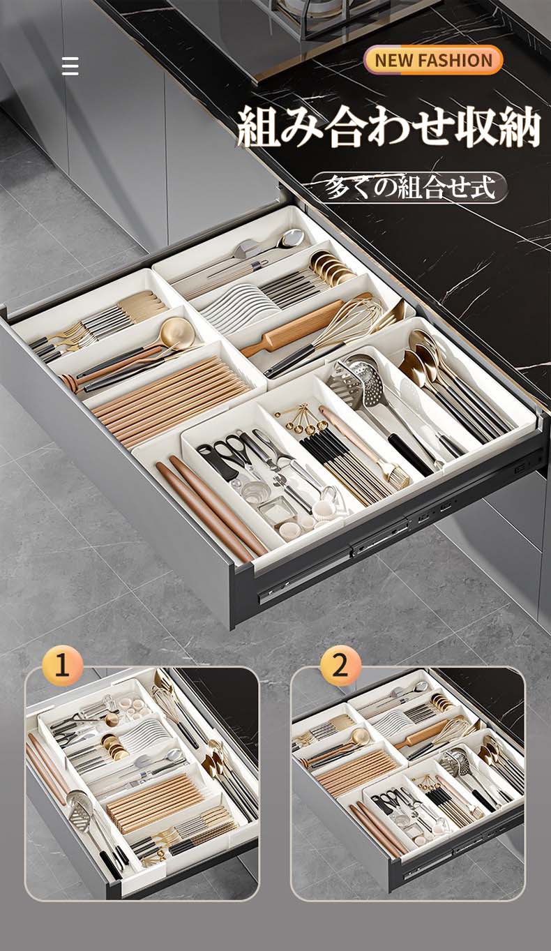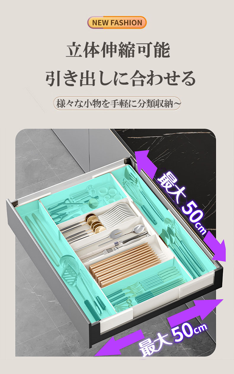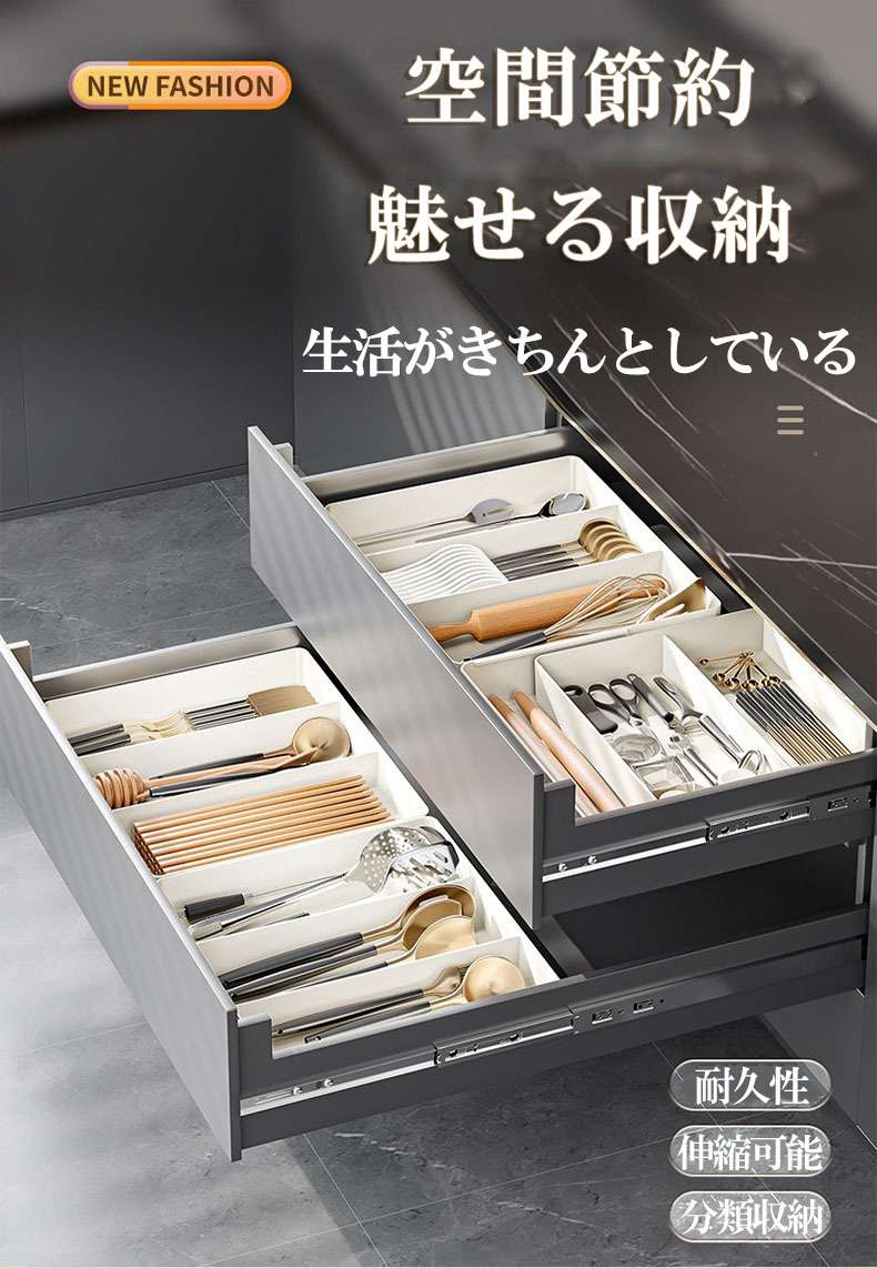 システムキッチンや食器棚の引き出しにムダな空間を作らず、カトラリーなどを分類しながら収納できる立体横伸縮カトラリーケース。