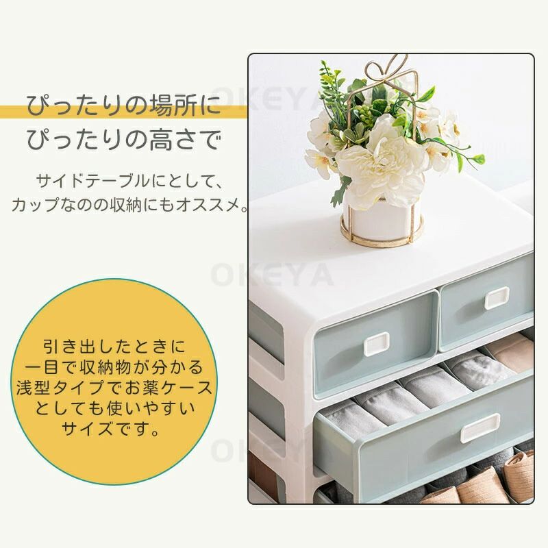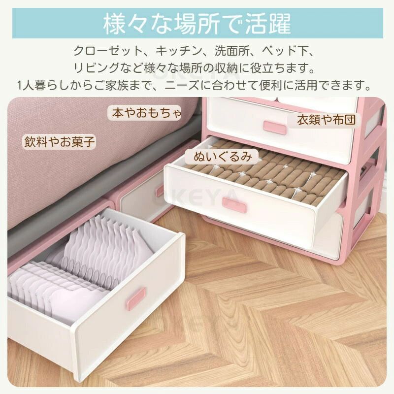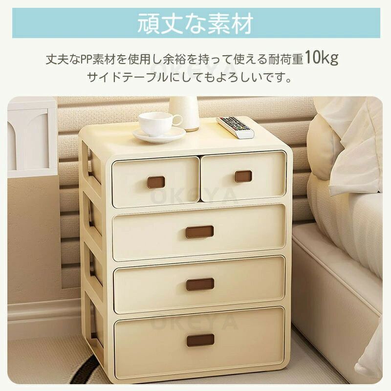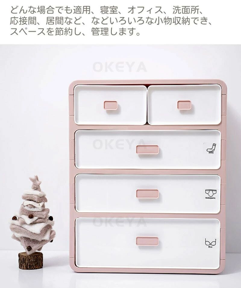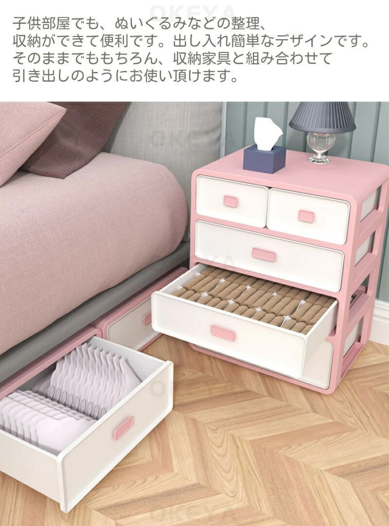 コンパクトなのに大容量!仕切り付きで整理して収納できるかわいい収納チェスト。 4段ある引き出しは、整理して収納できる仕切り付き。 PP樹脂材質を採用しており、防潮、防虫、防カビ、防湿の効果があります。耐久性も優れ、耐荷重も優れて非常に耐用です。長く使えます。 小型で持ち運びやすいため、クローゼット、ドレッサー、またはベッドの下に簡単に収めることができます!自由にどこにでも移動できます。スペースを占めません。 下着、靴下、レギンス、ネクタイ、スカーフ、ブラジャーを分類して収納します。ドレッシングの時間を50 %ほど節約できます。散らばりやすい小物もきれいに整理できます。 引き出しの外面には図案がプリントされていますので、対応ものをいれて簡単に分類整理できます。衣類やファイルやおもちゃやCDや漫画などを収納でき、リビングや部屋やタンスや棚や車のトランクの中に置くことができ、様々なシチュエーションで活躍できます。