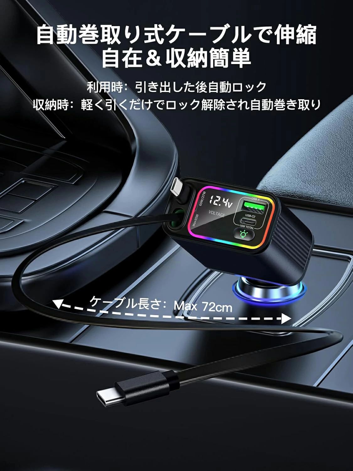【便利な巻き取り式ケーブル 方向調整可能】シガーソケット車載充電器 USB-A、USB-C、Type-Cケーブルを内蔵し、最大80cmまで伸縮可能です。巻き取り式のデザインはケーブル収納の悩みを解決します。ケーブルの収納の手間がかかりません、持ち運ぶ時も邪魔になりません。巻き取り式充電ケーブル 120°方向可能な機能により、ケーブルをどの方向にも向けることができ、デバイスの接続や充電が簡単に行います。