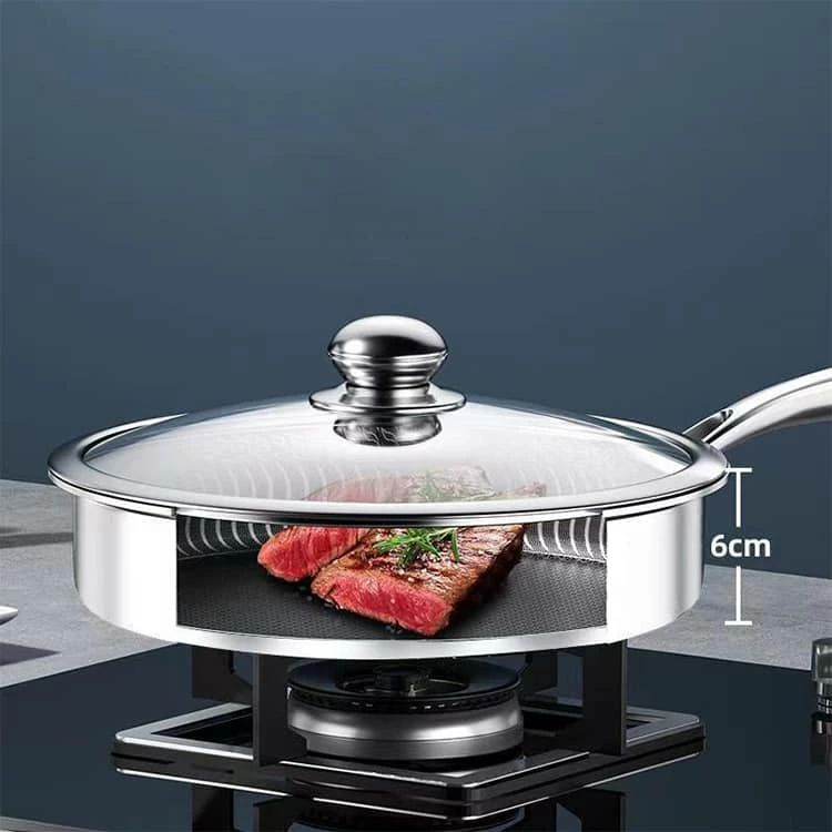 【より健康的で耐久性のあるフライパン】ステンレス製フライパンの表面には3000個以上のハニカム構造があり、鍋と食材の接触を小限に抑え、付着を効果的に防ぎます。 物理的にこびりつきにくく、コーティングされておらず、有害な物質が含まれていないため、調理がより健康的になります。