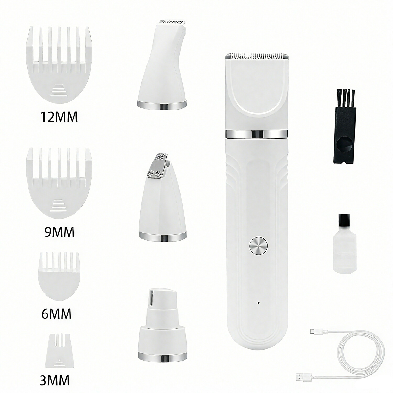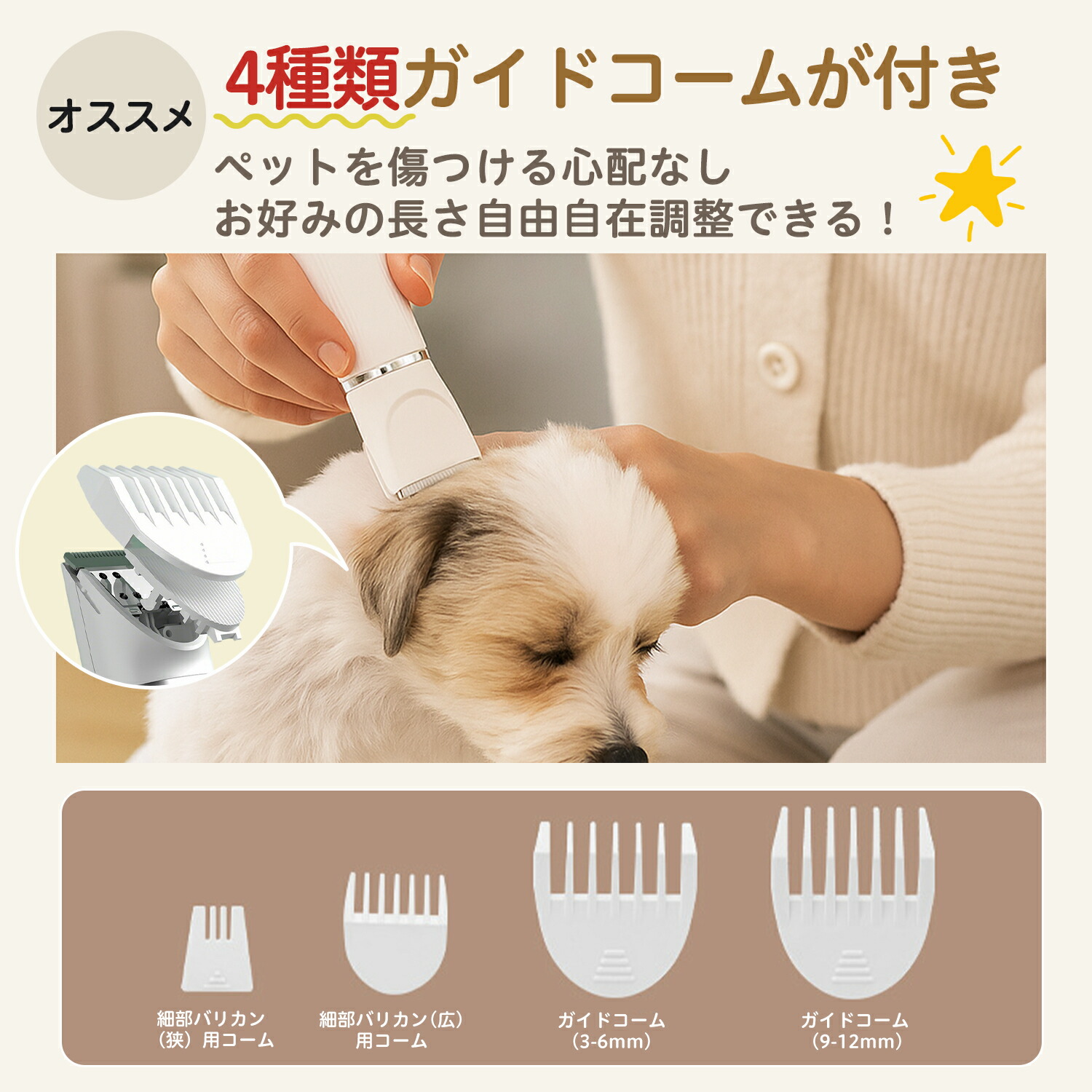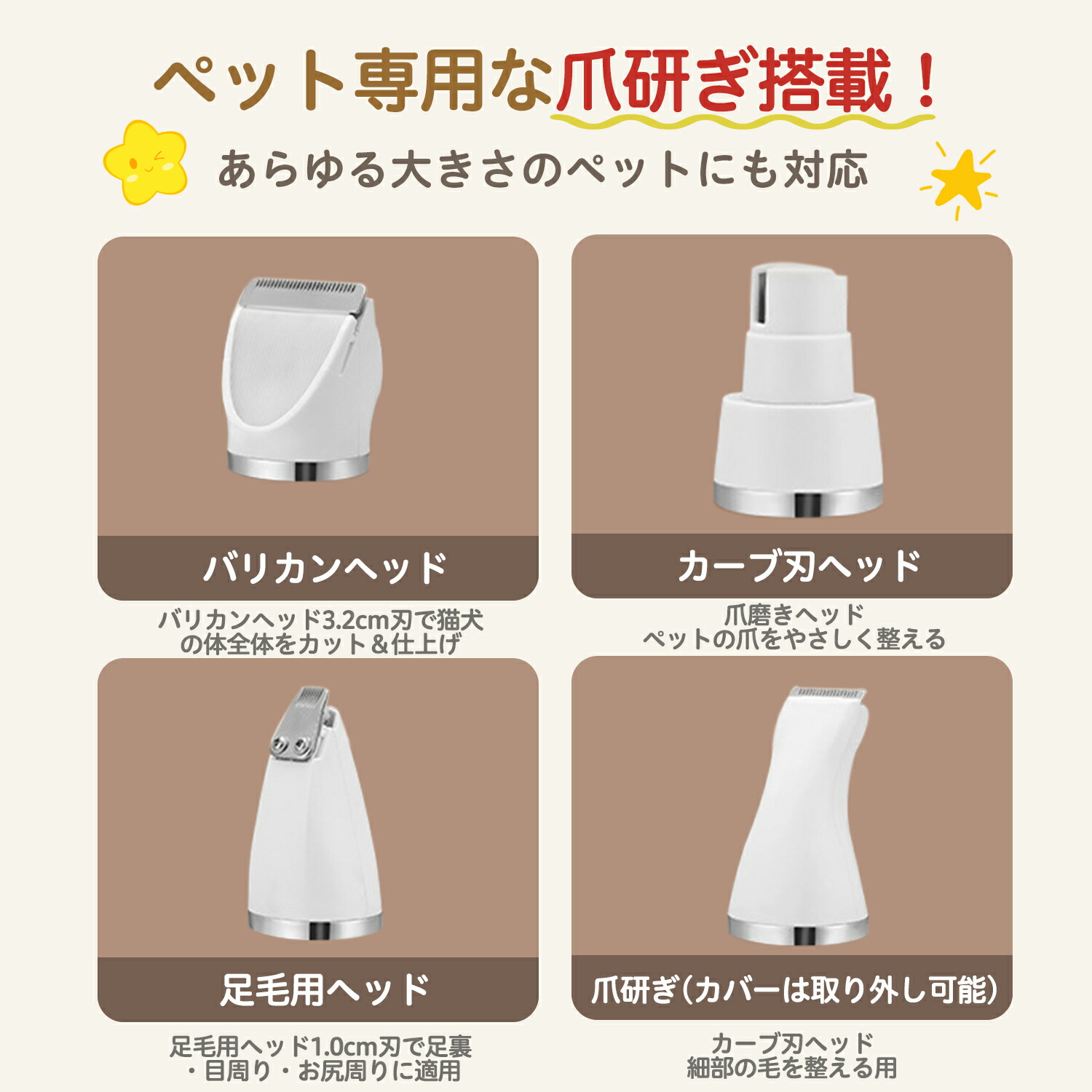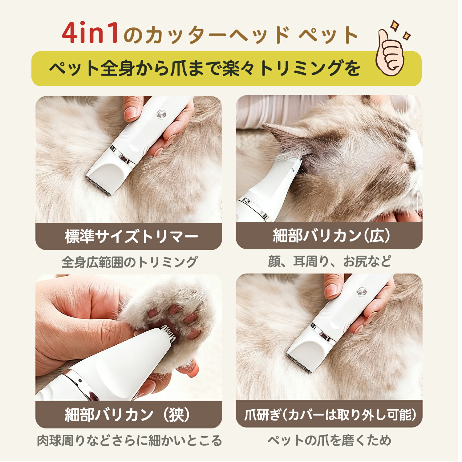4種類のヘッドとガイドコーム付きの4in1ペット用バリカン。足裏や耳、顔周りなど細部から全身まで対応でき、家庭で簡単にプロのようなトリミングが可能です。