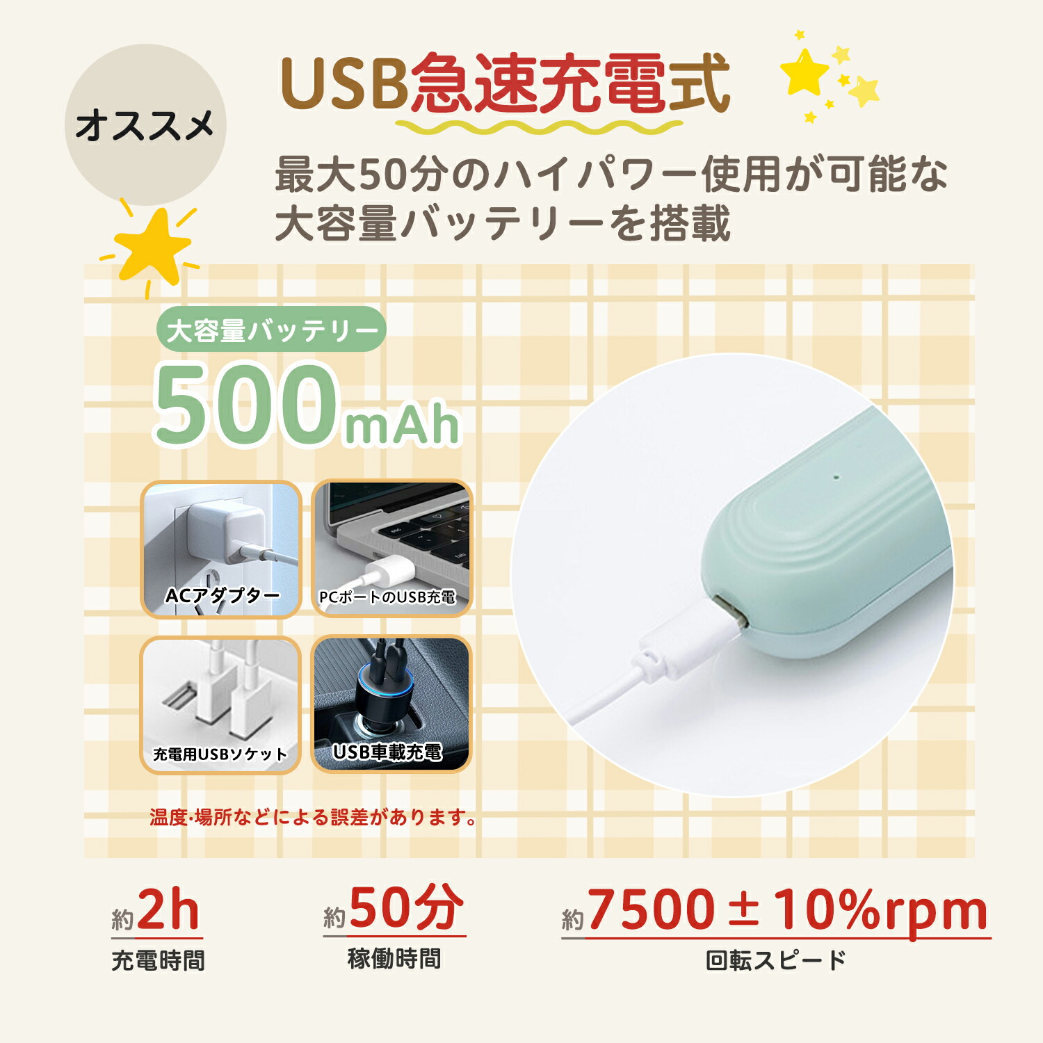 大容量800mAhバッテリー搭載で最大約180分連続使用可能。USB急速充電に対応し、日常のお手入れに便利です。犬猫問わず多頭飼いにも最適です。