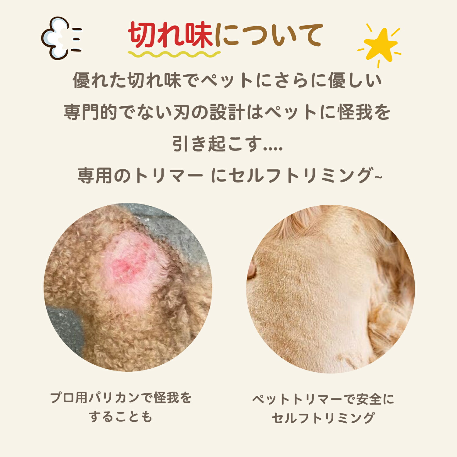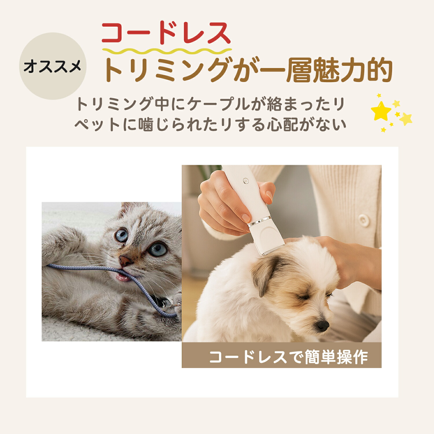 この4in1ペットバリカンは、犬・猫の全身グルーミングを自宅で安全かつ手軽に行うための多用途トリミングツールです。足裏や肉球まわり、耳、顔などの細かい部分から、体全体のカットまで1台で対応でき、静音・低振動設計のため怖がりなペットや初心者の方にも適しています。コードレスで取り回しが良く、日常のお手入れはもちろん、換毛期のケアや定期的な身だしなみ管理にも活躍し、サロンに行く時間や費用を抑えたいご家庭に最適です。