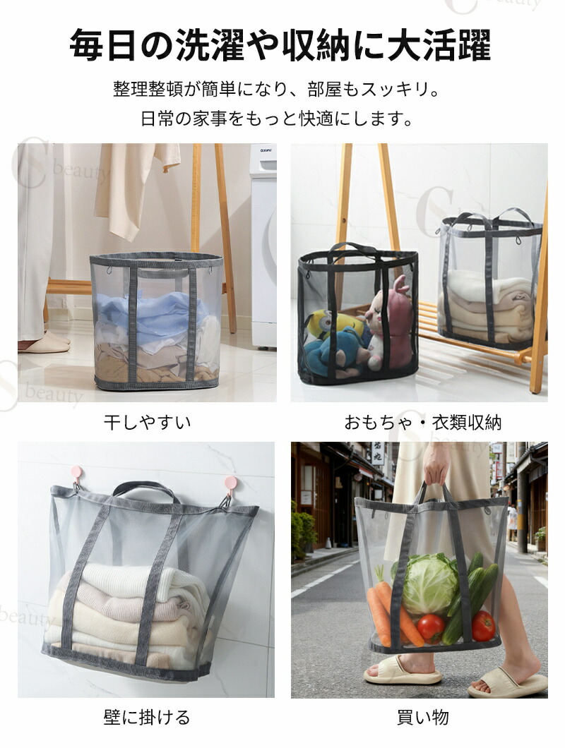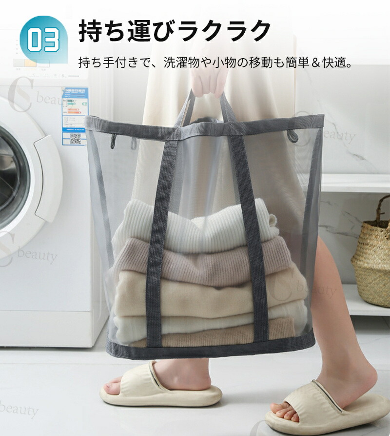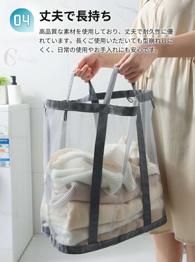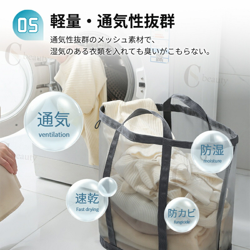 ランドリーバスケットはメッシュ素材を採用しており、通気性が良く、湿気やニオイがこもりにくく、清潔に使えます。