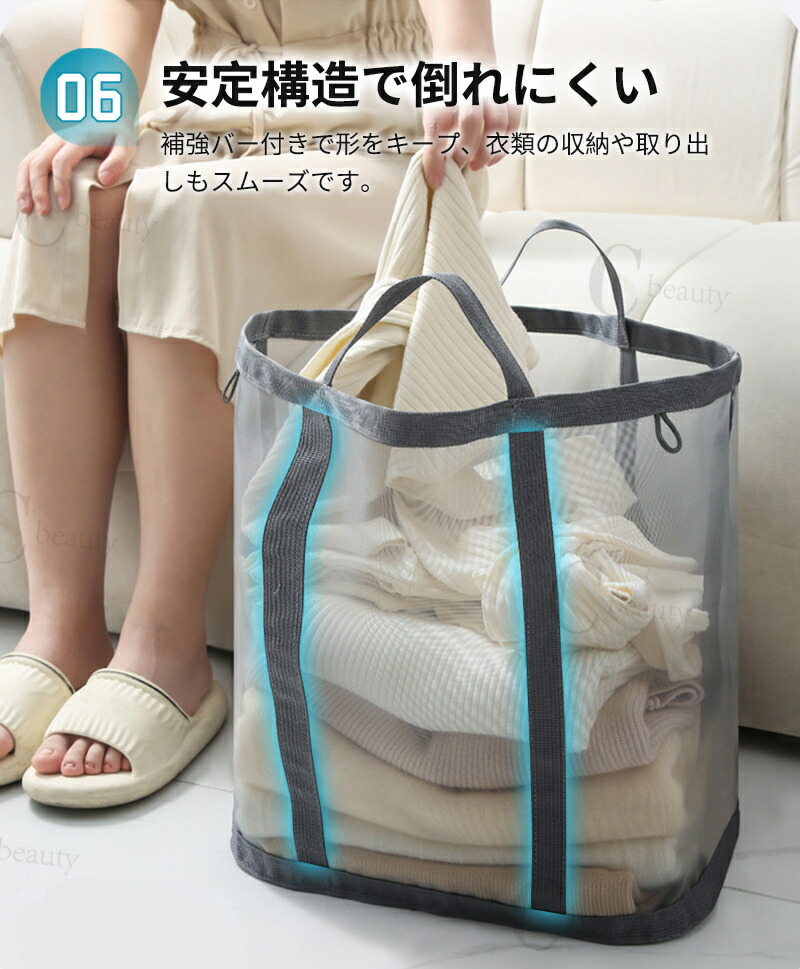 バスケット本体は補強バー付きで形をしっかり保持し、倒れにくく、収納が簡単です。