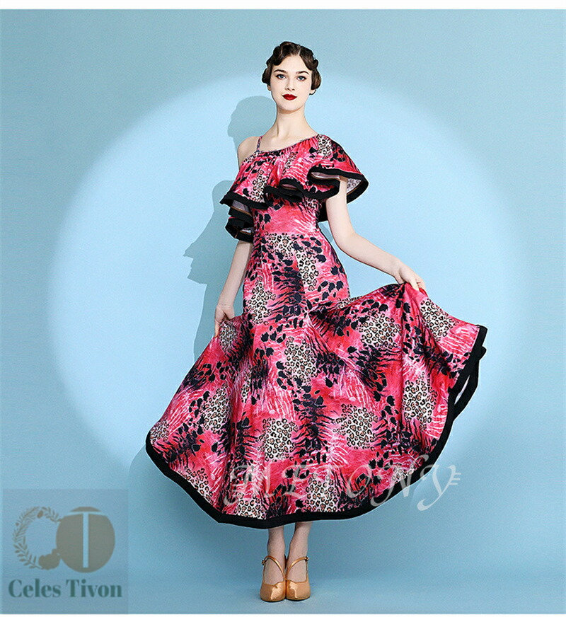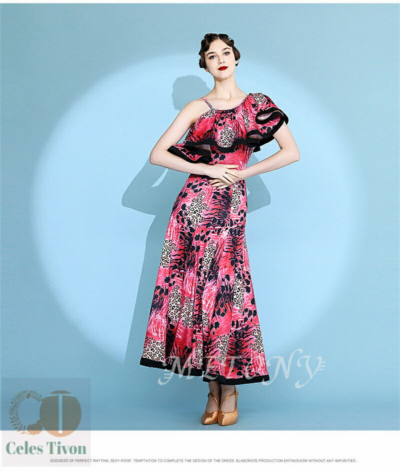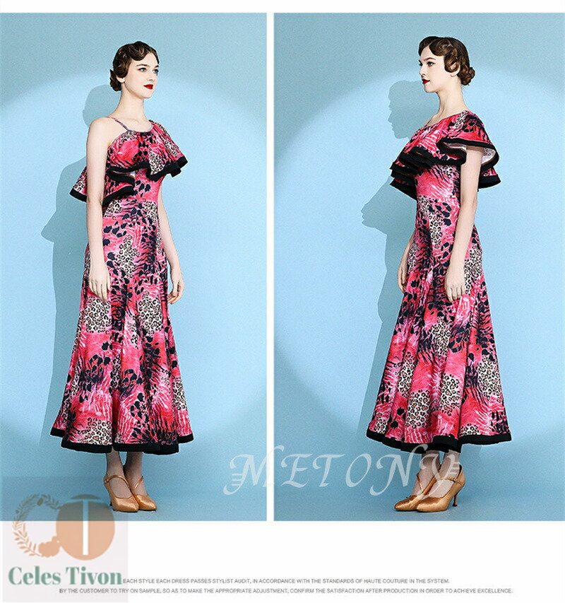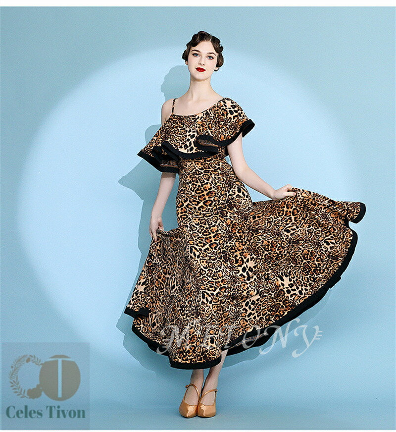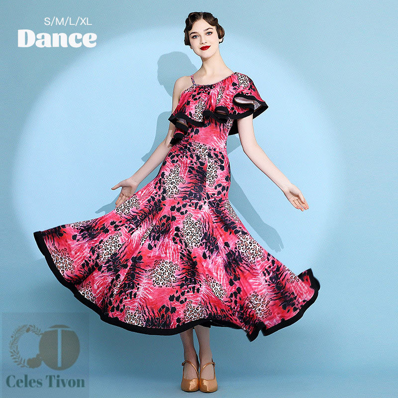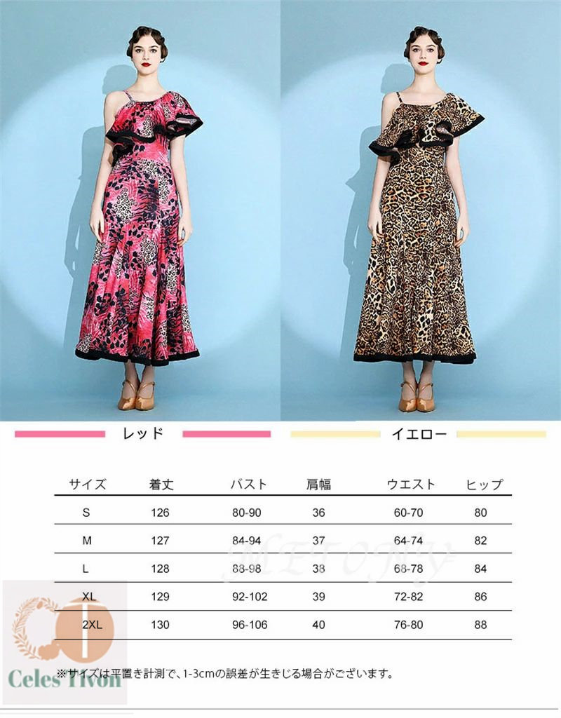 レディース ダンスドレス ロングドレス 体操 ダンス 社交ダンス ウェア 通販 赤ヒョウ柄 黄ヒョウ柄 S M L XL 2XL