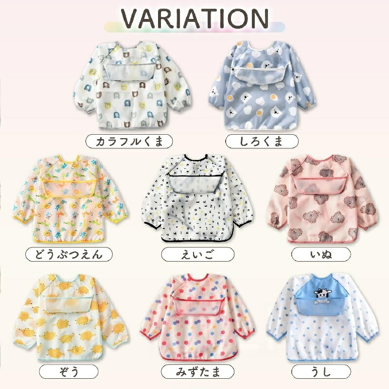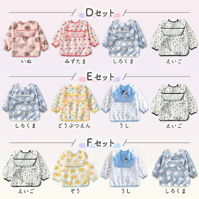 お食事エプロン 長袖 半袖 防水 撥水 長袖(Mサイズ) 長袖(Lサイズ) 半袖(Mサイズ) 半袖(Lサイズ) Aセット(カラくま/動物/英語)+ぞう Bセット(カラくま/白熊/動物)+英語 Cセット(カラくま/動物/ぞう)+牛 Dセット(犬/水玉/白熊)+英語 Eセット(白熊/動物/牛)+英語 Fセット(英語/ぞう/牛)+白熊 G(白熊/カラくま/ライオン/英語) H(白熊/カラくま/こびと/英語) I(白熊/カラくま/英語/ウサギ) J(白熊/カラくま/ライオン/ウサギ) K(白熊2枚/カラくま2枚)