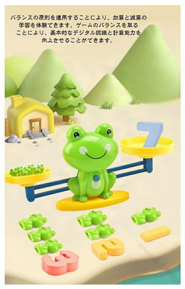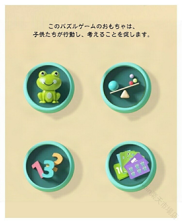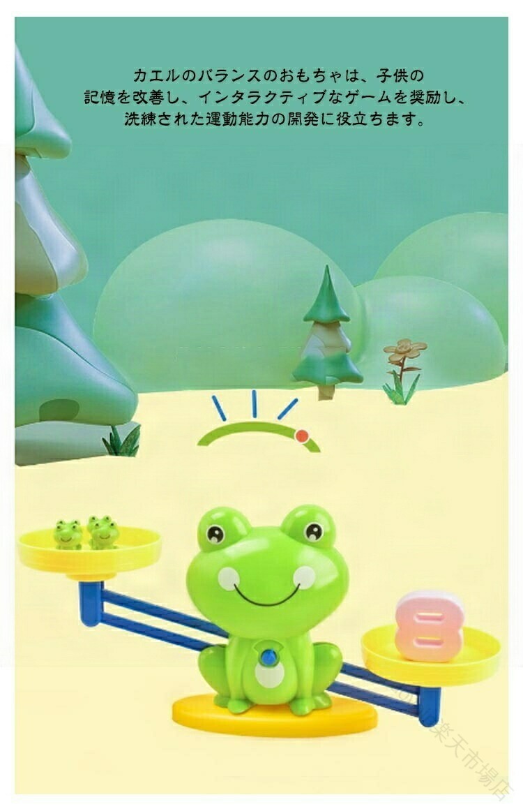 【知育玩具セット】子どもたちが数字をよりよく理解して認識するためには、実際の物体に触れて実際の物体に向き合って数字を理解する必要があります。バランスの原則を適用することにより、加算と減算の学習を体験できます。ゲームのバランスを取ることにより、基本的なデジタル認識と計算能力を向上させることができます。【インタラクティブ玩具】このパズルゲームのおもちゃは、子供たちが行動し、考えることを促します。保護者と教師は、3色の小さなカードを使用して質問したり、子どもたちが自分で練習するように促したりできます。 子供たちに遊びながら知識を学ばせましょう。【カエルのバランス】カエルのバランスのおもちゃは、子供の記憶を改善し、インタラクティブなゲームを奨励し、洗練された運動能力の開発に役立ちます。 カラフルな数字とカードのデザインは、子供たちが色について学ぶのを助けるために目を引くものです。【セット内容】パッケージには、19個の小さなカエル、30枚の両面カード、10個の数字モデル、1個の天秤、1個のベース、2個の計量皿、および説明が含まれています。【完璧な贈り物】誕生日、子供の日、クリスマス、その他の休日、または子供のパーティーに最適です。 3歳以上の男の子と女の子に対する報酬または賞品。