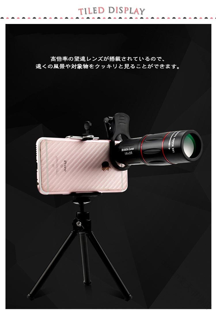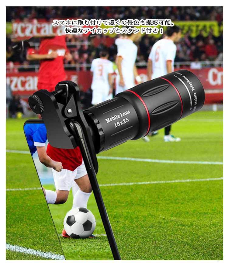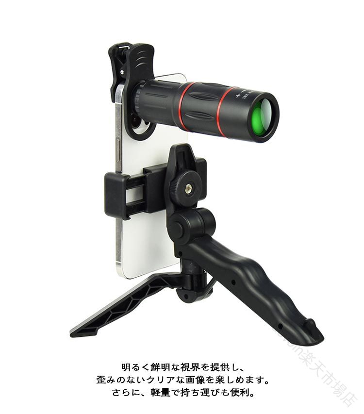 スマホ用望遠レンズ 18倍 フルセット 単眼鏡 望遠鏡 セルカレンズ 三脚付き ライブ配信 旅行 コンサート観戦用 簡単装着