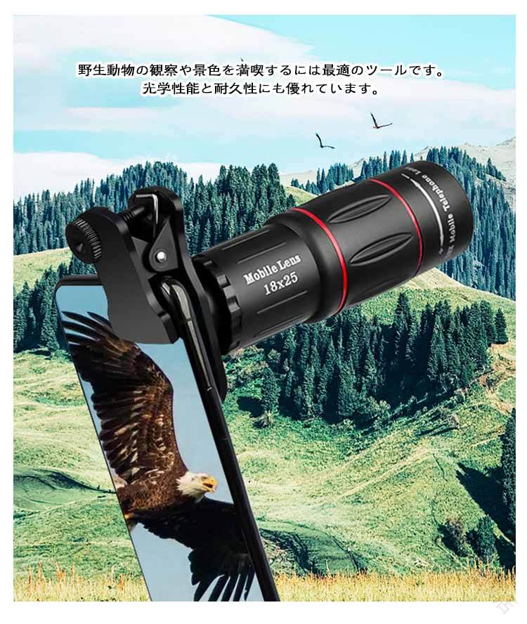【スマホ用カメラレンズ】【18倍】【フルセット】コンサートやライブなどのイベントで使用すると、 ステージ上のアーティストがまるで目の前にいるかのような感覚を味わえます。スマホに取り付けて遠くの景色も撮影可能。快適なアイカップとスタンド付き!高倍率の望遠レンズが搭載されているので、遠くの風景や対象物をクッキリと見ることができます。野生動物の観察や景色を満喫するには最適のツールです。光学性能と耐久性にも優れています。明るく鮮明な視界を提供し、歪みのないクリアな画像を楽しめます。さらに、軽量で持ち運びも便利。フルセット内容:【単眼鏡】【アイカップ】【スマホ接続クリップ】【三脚】【クリーニングクロス】【アウトパッケージ】セットM内容:【単眼鏡】【手持ちスタンド】【E型クランプ】【スマホ接続クリップ】【アイカップ】【クリーニングクロス】