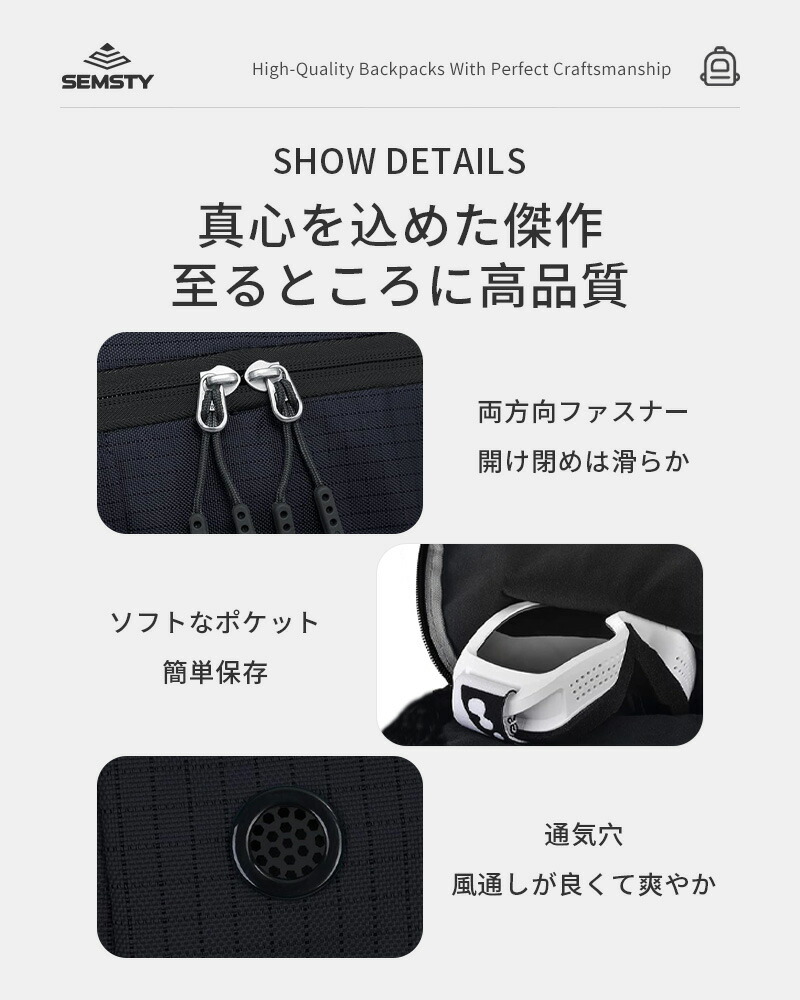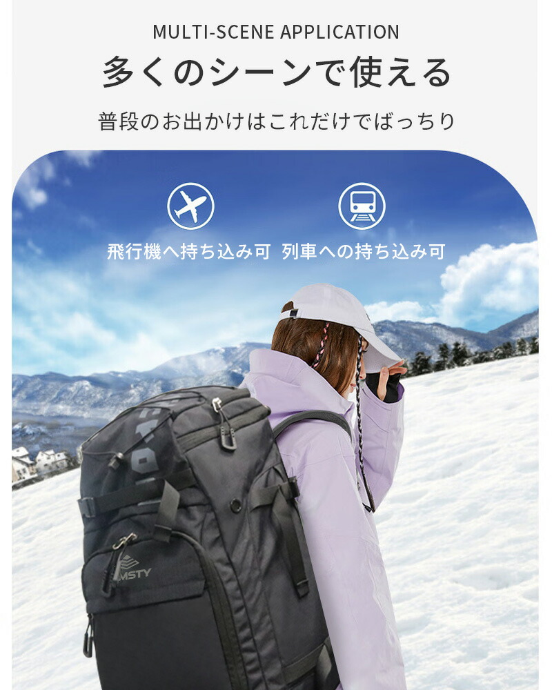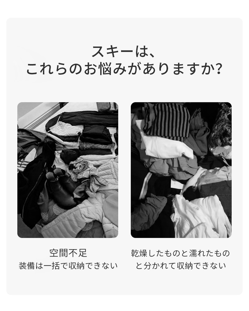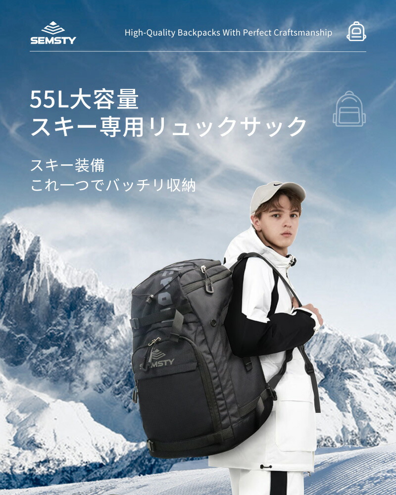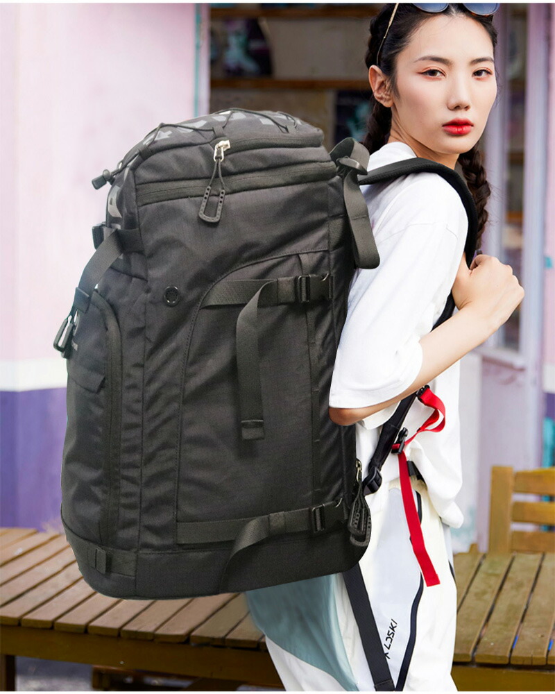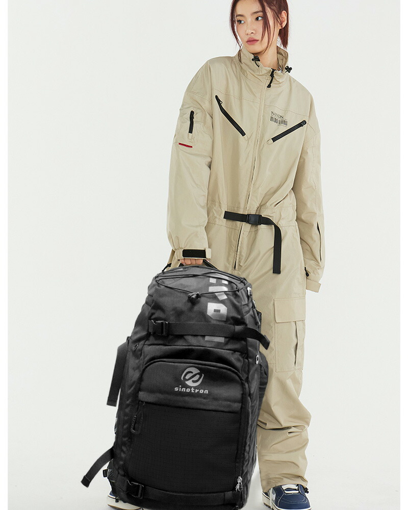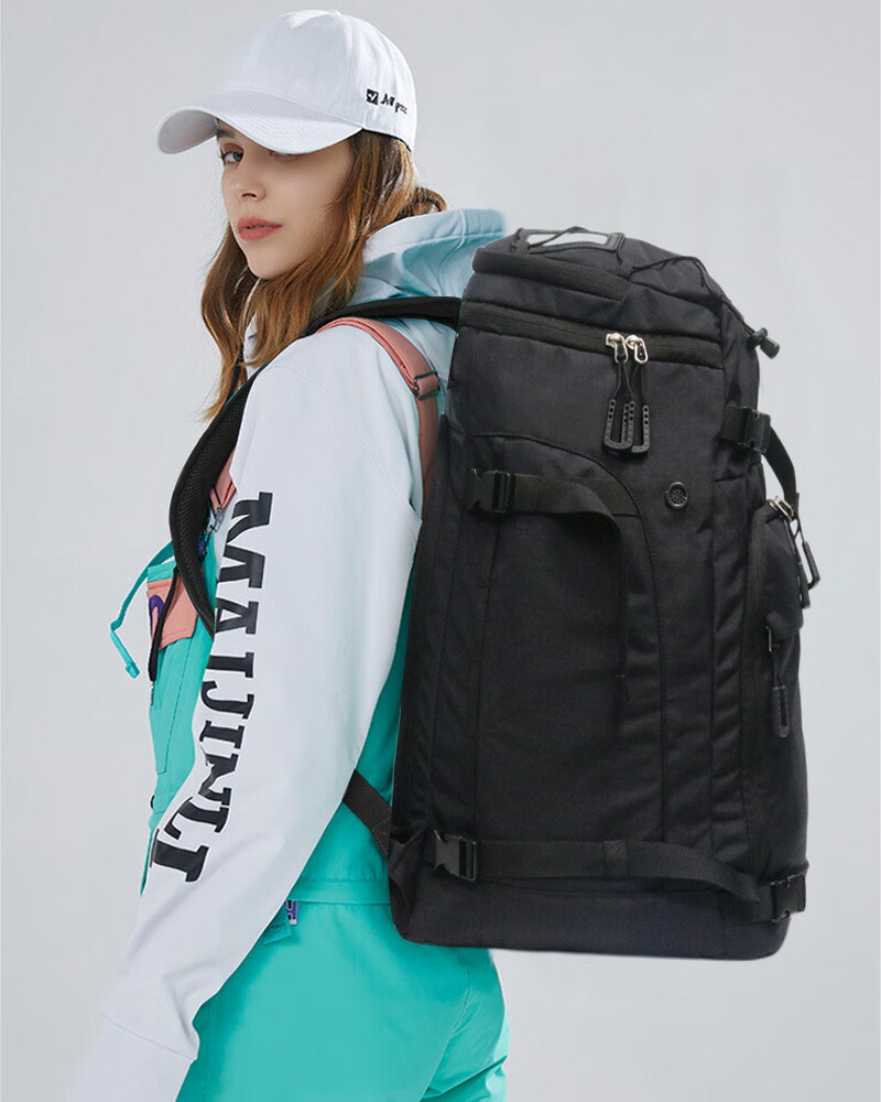 【実用性多機能性】各サイズのスキーブーツは収納可能です。そして外側にコンプレッションベルト付き、スキー板やボードを挿し込んで持っていくことができます。両サイドのコンプレッションベルトには、トーチなどの小さなものを吊るすためのランヤードを装備しています。使い勝手の良い大型のジッパーヘッドを採用し、手袋をしたままでも簡単にアクセスできます。
