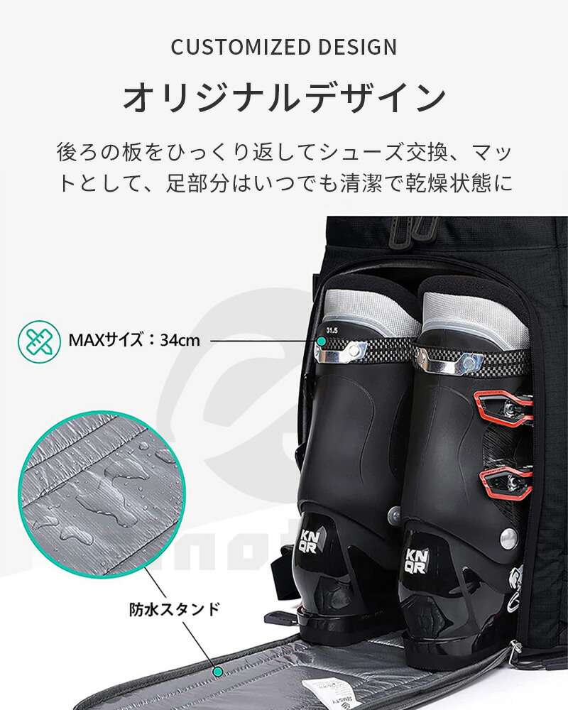 【便利なデザイン】スキーブーツバッグのフロントとバックのポケットは180°開閉でき、サイドのジップを開けるだけで簡単に物を出し入れすることができます。背面のフラップを開くとマットとして使用可能。内側は防水防汚に優れたアルミホイルの防水布生地。汚れを防ぐだけでなくお手入れも簡単です。