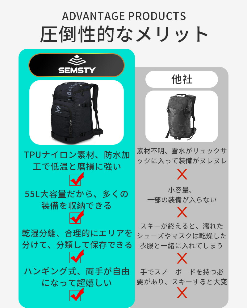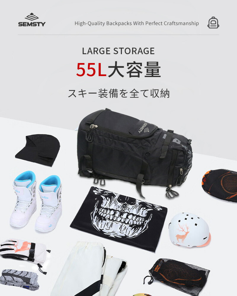 【55L大容量と多機能ストレージ】スノーボードブーツバッグサイズ:52.8cm*33.8cm*21.75cm、55L大容量でスキーブーツ、ヘルメット、スキーウエア、日焼け止め、カメラの予備バッテリーなど必要なアイテムをまとめて収納できます、収納力が抜群です。スノーボード等の装備品はすべて収納揃います。
