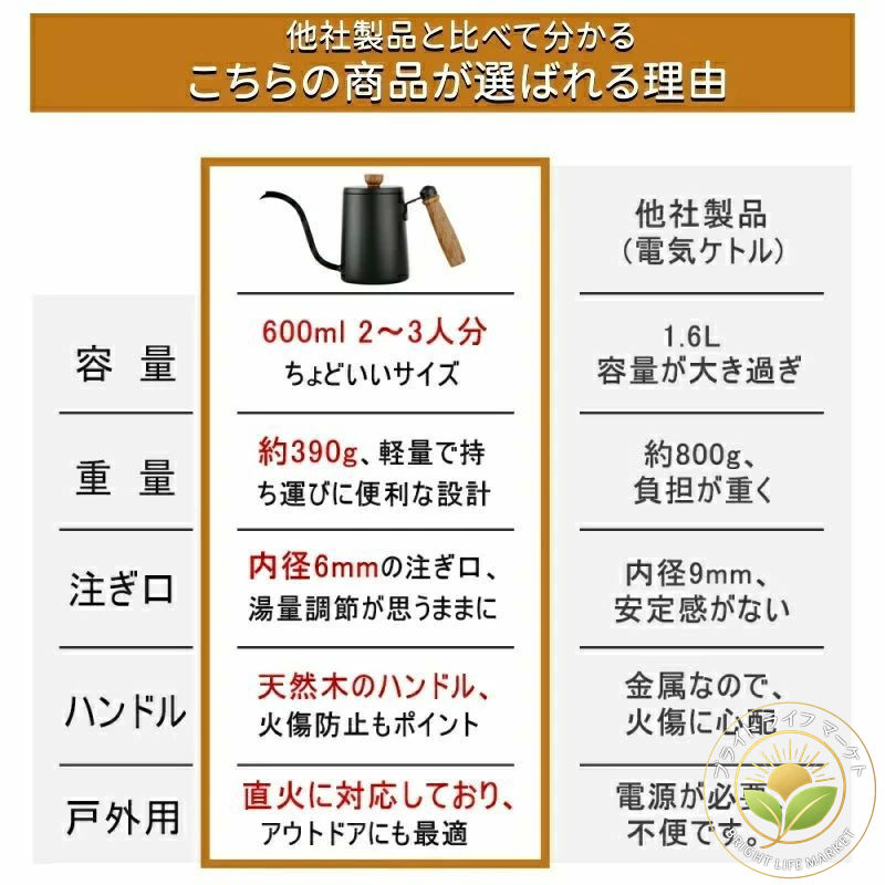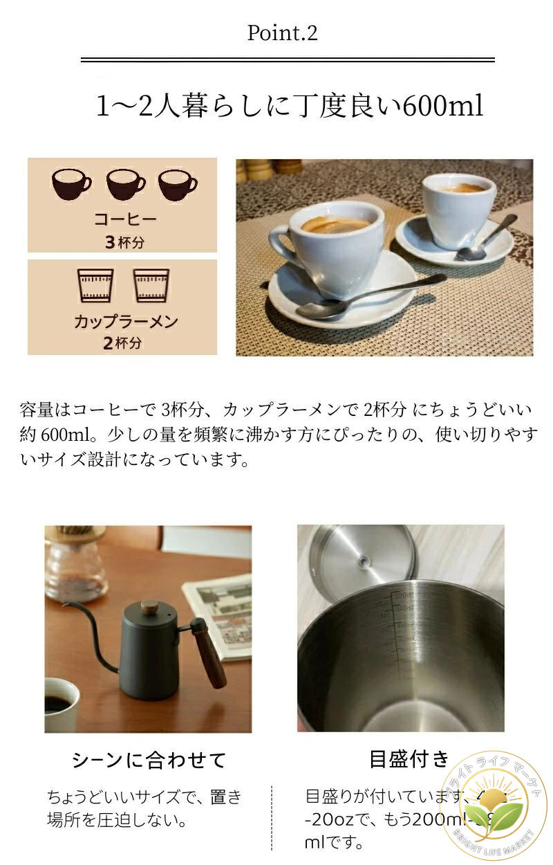ちょっとしたタイミングから普段使いまでちょうどいい0.6L((1~2人暮らしに)で、必要な量だけを素早く湯沸かしできる便利なコーヒーポットとしても使いやすい仕様です。コーヒー好きの自分へのご褒美から父、母、奥様、友人など、ファミリー層にも一人暮らしの方にも重宝されるギフトとなります。