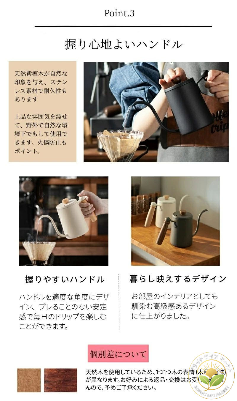 ハンドルは天然木を使用し、耐熱で、水を温めても熱くならない。 斜めのハンドルグリップの構造で、握り方に合った取っ手で楽々コントロール。握りやすく、手になじむ取っ手は、簡単にお茶やコーヒーを淹れることができます。