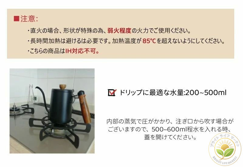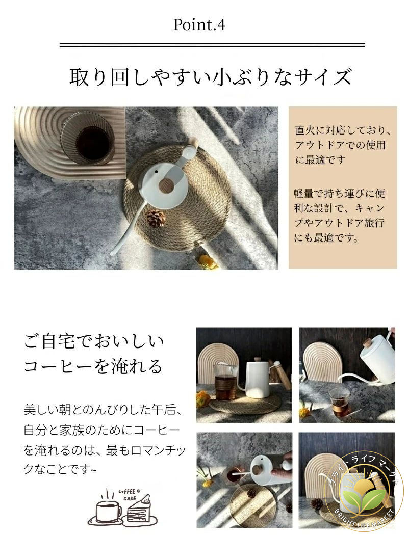 6mmの極細注ぎ口のデザイン且つグースネックの構造で、湯量をコントロールし、繊細な作業ができます。注ぎ口先端部の内面を研磨しているため、お湯の出る勢いが丁度いい、打点がしっかり定まります。また、注ぎ口の高さはポット自体より少々高くて、湯が沸き立っっても溢れません。完璧な注ぎ角度なので美味しいコーヒーが淹れられます。初心者でもお使えるコーヒーポットです。