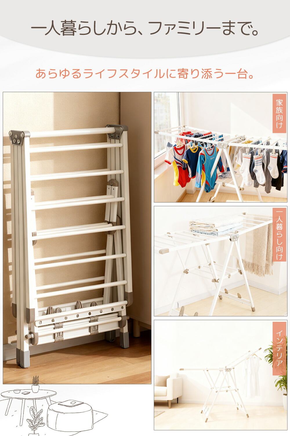 折りたたみハンガーラックは広がるアームが特徴で、一度にたくさんの洗濯物を干すことができます。靴掛けと靴下干し用クリップが付きます、大型の洗濯物や布団カバーも干せる余裕があります。普段の洗濯物から季節ごとの厚手の布類まで、さまざまな用途に活躍します。