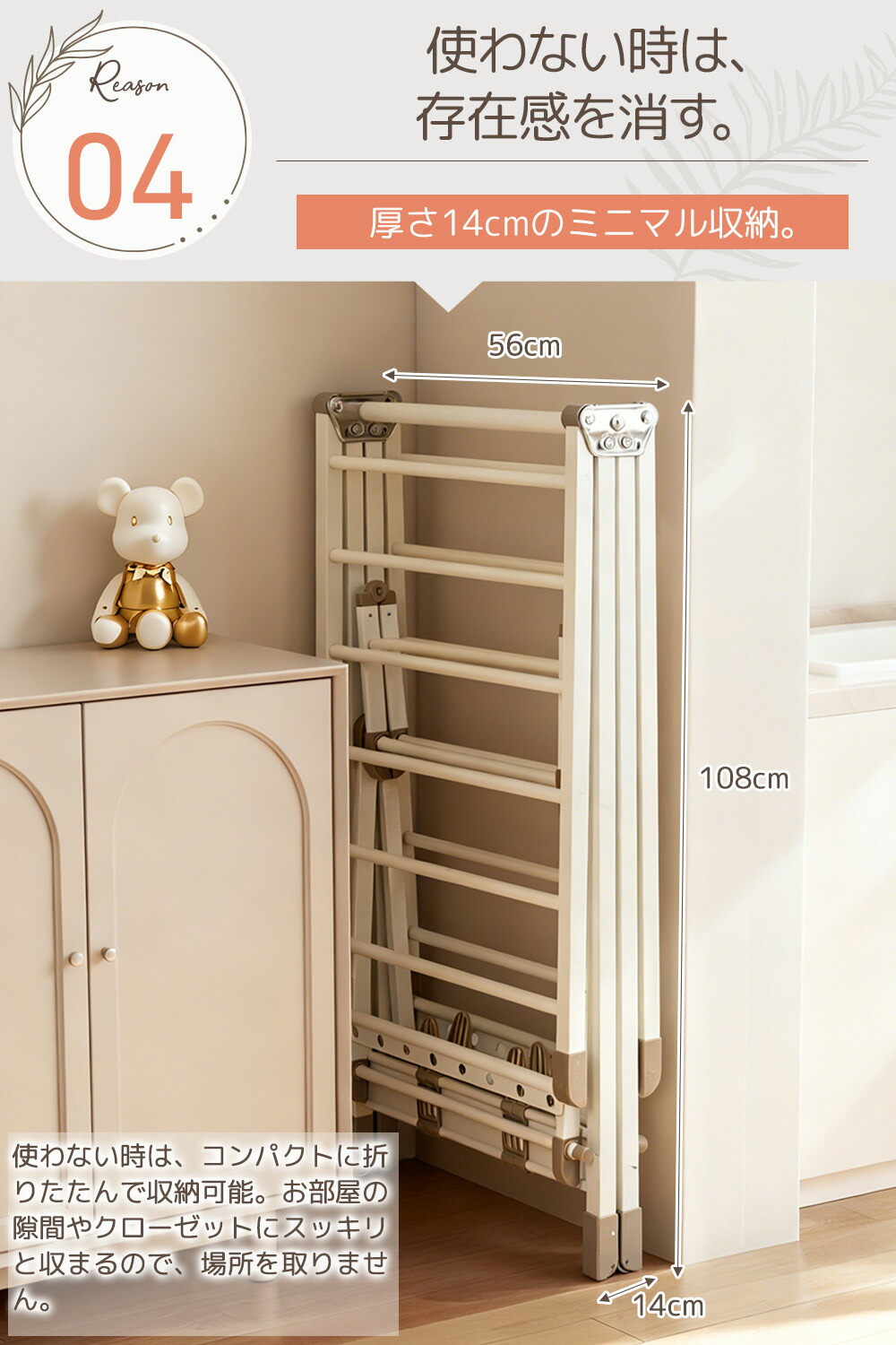組立不要で、折りたたみ後は幅 14cm のコンパクトサイズになり、家具の隙間や壁に立てかけて収納できるので、部屋のスペースを無駄にしません!特に限られた収納スペースを有効活用したい方に最適です。