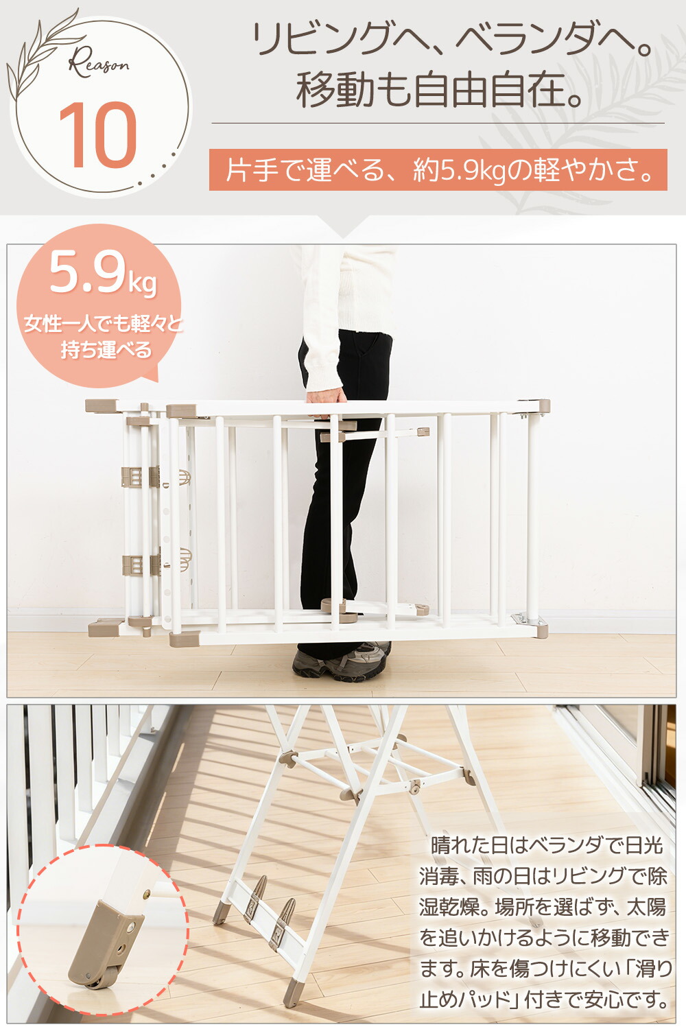底部に隠しキャスターが付いているので、衣類がいっぱいでも楽に移動でき、 急な雨でもいちいち物干しラックから服を取り外す必要がなく便利で省力化できます。